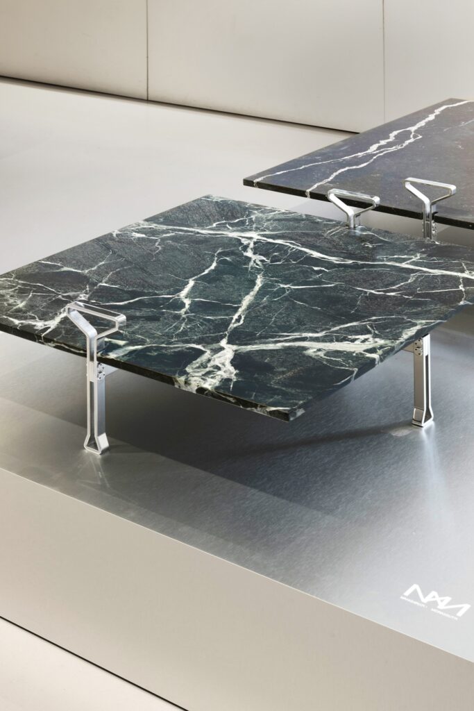 The structure is crafted in precision-machined anodised aluminium, paired with marble tops selected for both material integrity and historical fidelity.