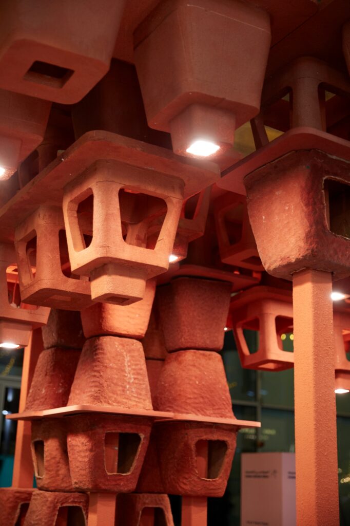 Tee Vee Fff’s ‘Pulp Fractions’ ingeniously transformed discarded paper and cardboard into stackable, adaptable structures that harness wind and light, offering sustainable versatility and an inspiring narrative of innovation and aesthetics.