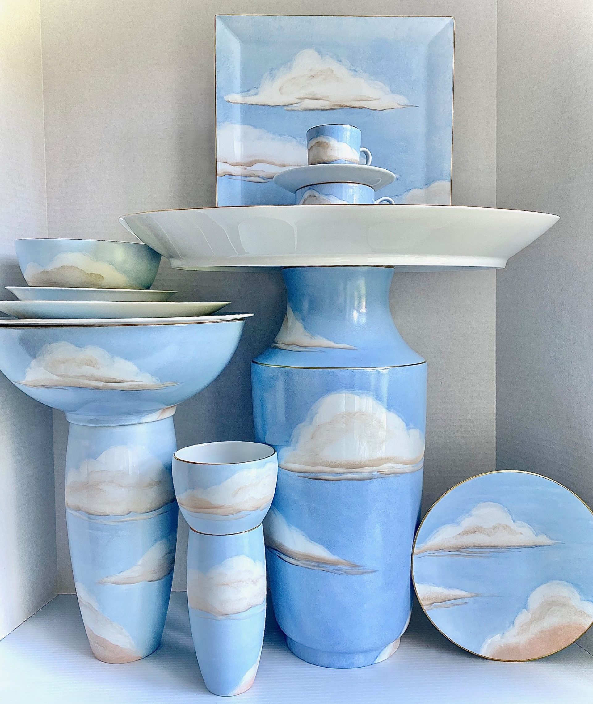 Describing his collaboration with Marie Daâge, Jonathan Hansen explains: “Both the theme of the blue sky and my choice to work with Marie Daâge and her reputed Limoges porcelain craftsmen acquire a particular significance today. A much-needed lightheartedness, serenity, and playfulness emanate from the Ciels Bleus designs, one that radiates beyond the objects and onto the very setting in which they are presented. By embracing the use of porcelain, working hand-in-hand on this year-long creative process, Marie Daâge and I manifest our shared deference and respect for the time-honored craftsmanship techniques carried on by the Limoges artisans, ones that are all-the-more essential to preserve today.