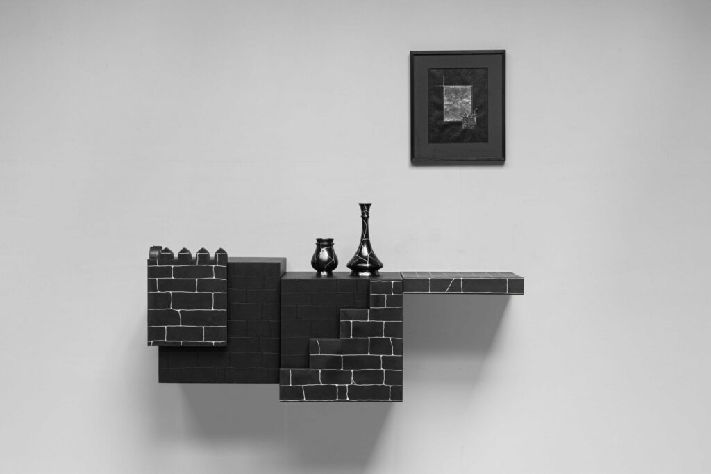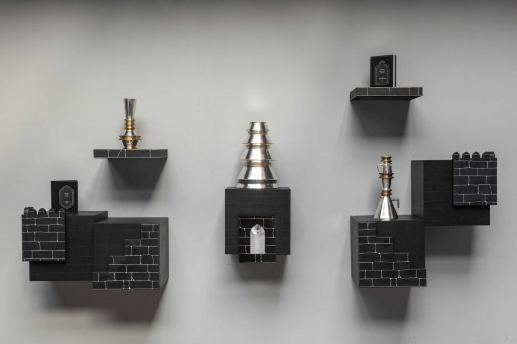 “Bidar-chitecture Shelving and Storage Units”, a part of Gupta’s exhibition, exemplify this approach. These units, crafted from Bidri, leather, and plywood, measure 38cm x 38cm x 38cm per unit, with shelf dimensions of 38cm x 33cm x 5cm. Available in editions of 12 per unit, with open editions for the shelves, these units are inspired by the Bidar fort and the exquisite 16th-century Bidri craft. Master Craftsman and National Awardee Mohammed Abdul Rauf collaborates on these pieces, showcasing the intricate silver inlay on blackened white brass, a hallmark of Bidriware, a 14th-century Indian metal handicraft originating from Bidar, Karnataka. The leather lining is provided by Delhi-based atelier Loco Design. The units were created in 2025.
