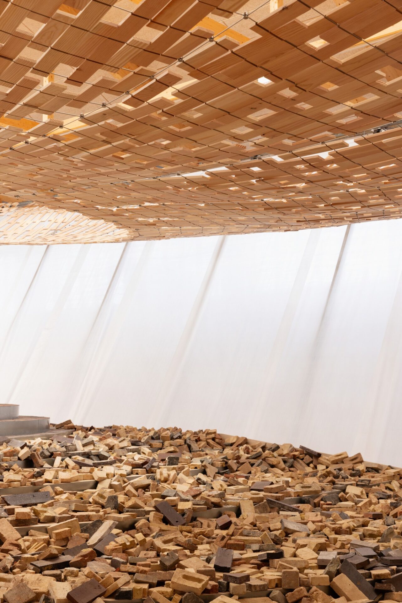 Light plays a defining role in the installation. The structure is designed to filter and modulate daylight across the space, drawing from the Japanese concept of komorebi, the shifting patterns of sunlight through trees. As the day progresses, the installation subtly transforms, not through mechanical intervention but through natural variation, making time itself a material condition of the work.