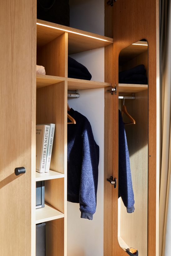 Lumipod is wrapped into a black Douglas exterior cladding, following the Shou-sugi-ban Japanese tradition and the interiors has been designed following the standards of high-end hotel rooms. The wall cabinetry and the floor are made of natural oak. The ceiling is covered with a merino wool felt fabric. Curtains over the entire glass surface allow to block out the daylight. The fully-tiled bathroom comprises of a toilet, a shower and a sink.