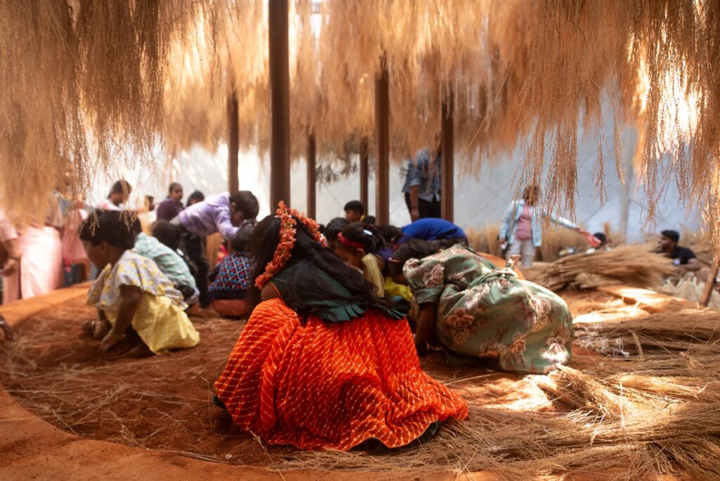 Where the Wild Things Are, designed in red earth and suspended foliage, was less an installation and more a temporary forest. Created by Made in Earth Collective, the space used locally sourced materials like Chowchi kaddi, Casuarina, Thagate gida, to form a tactile, breathable environment.
