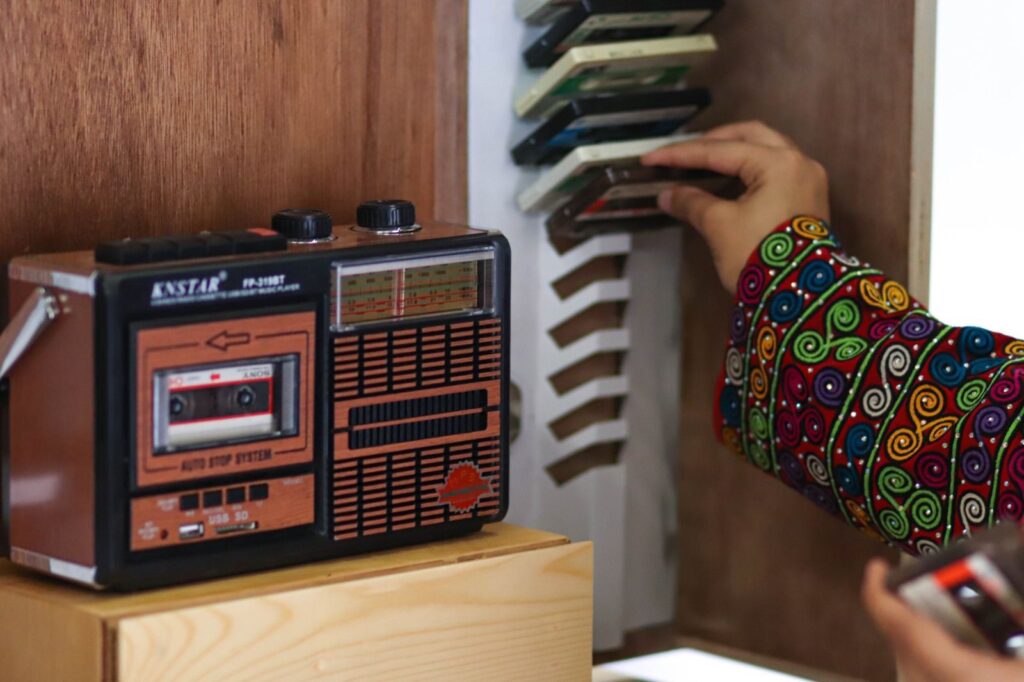 Somia Dorzadeh is dressed in her traditional Balochi attire and seems camouflaged between the temporary cabinets that she has created as a memoir of her life as a foreign resident within Qatar; neither here nor from her country of origin, but hanging in the middle.