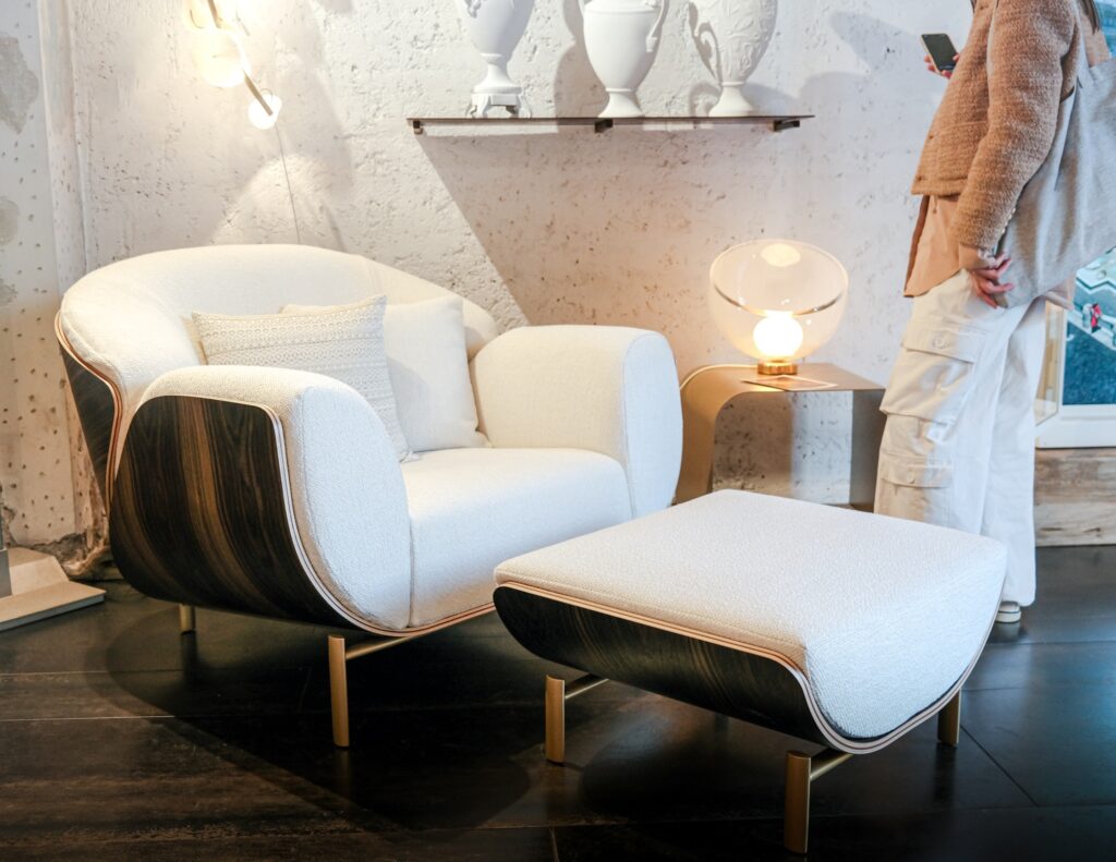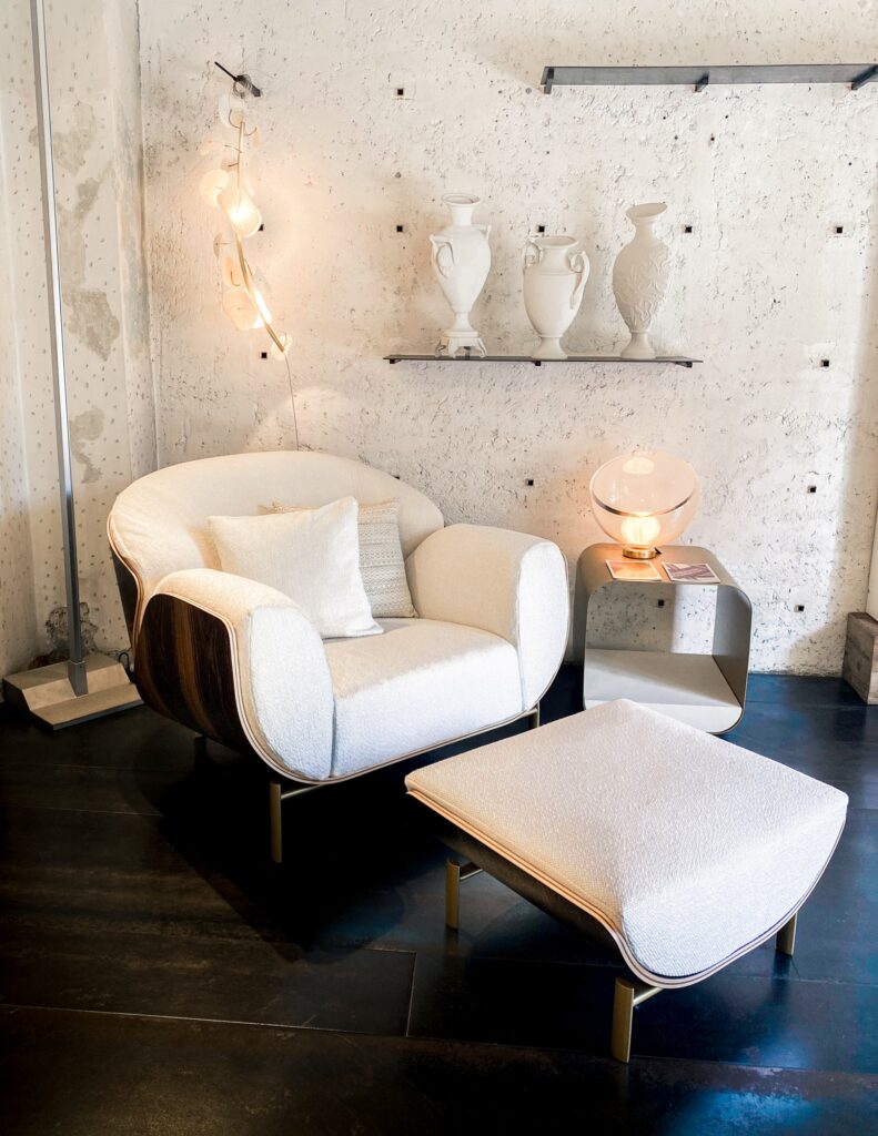 A selection of the Shurouq Collection is displayed at the Gallery, featuring the exquisitely crafted Haima Armchair and pouf, side table, and free-form carpet. Designed by talented local designers Maryam Suwaidi and Shua’a Ali, these remarkable pieces represent a fusion of Arab design sensibilities with the finest Italian craftsmanship. This collaboration serves as a platform to introduce the beauty and creativity of Arab design to the discerning Italian market, while also highlighting the exceptional quality and attention to detail that comes with furniture made in Italy.
