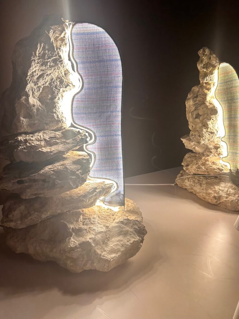 Nada’s wok titled 66km incorporates Moroccan silk textiles threaded with LED bulbs, atop a rock sourced from Qatar. This work explores alternative natural resources, drawing inspiration from resourcefulness observed in Moroccan traditions.