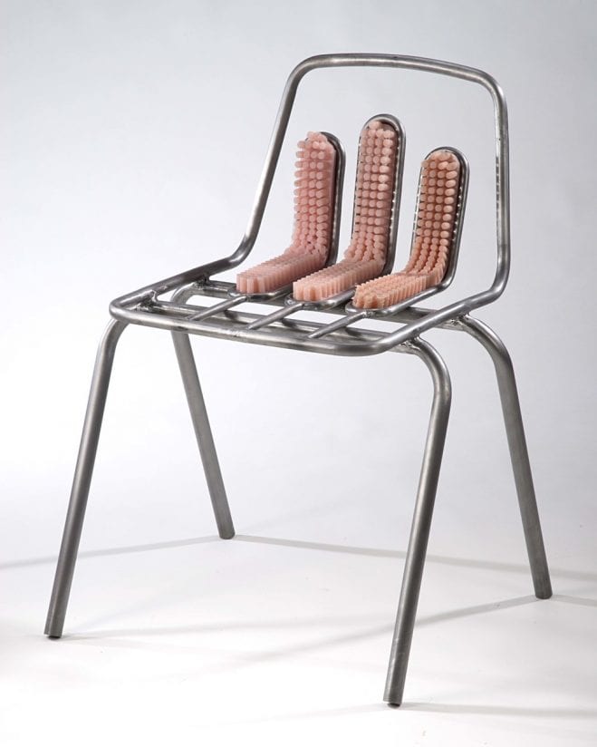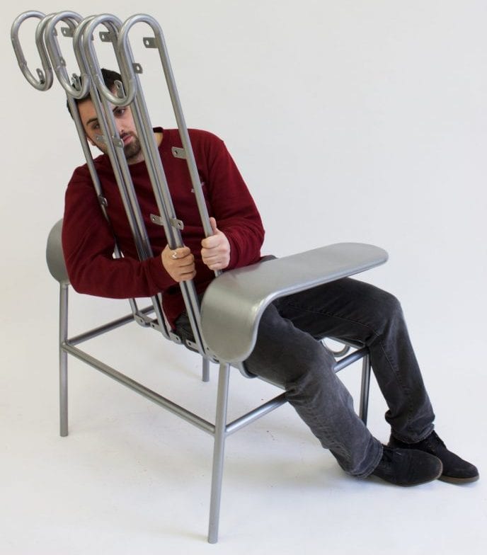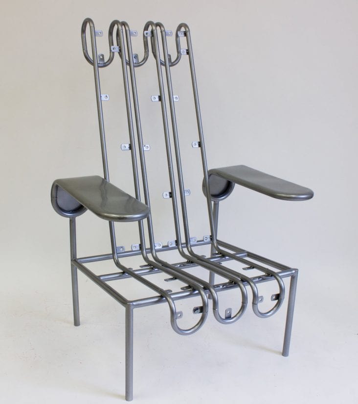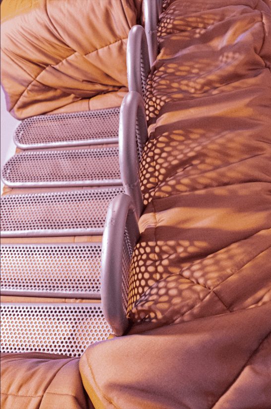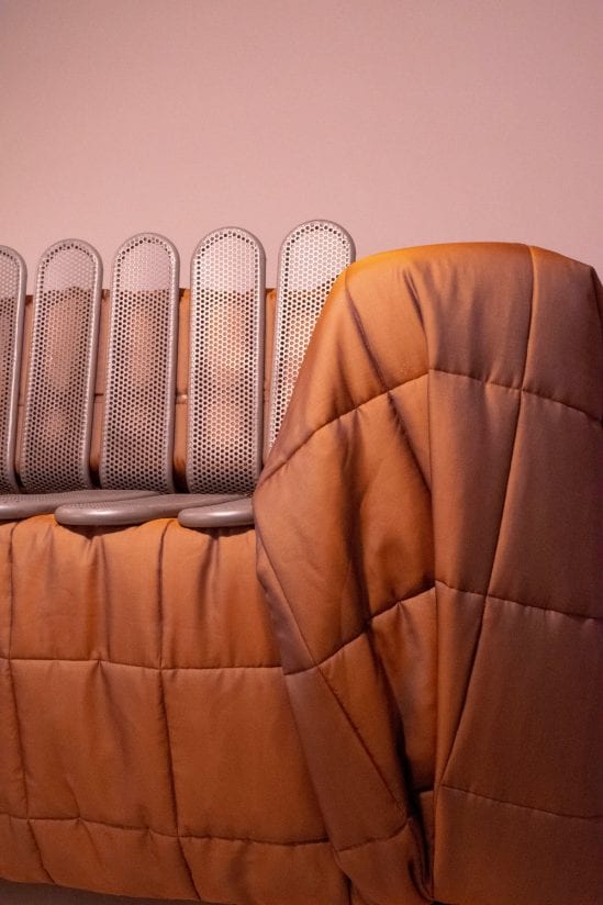 Love Seat: Inspired by airport benches, this love seat offers a space for two individuals to sit in very close proximity. Users can sit only on the perforated metal prongs. While they can feel and curl up to the upholstered surfaces, they are unable to truly sit on them. It consists of 10 perforated metal prongs attached to a wooden frame, upholstered using a silk quilt. This was part of Anya’s project series and are objects informed by temporary spaces of passage.