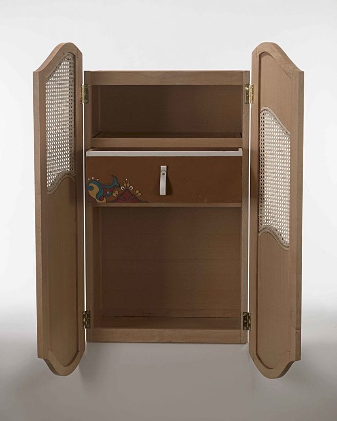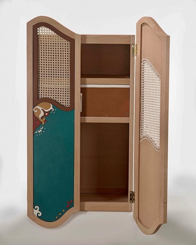 Inspired by Mexican Talavera Patterns, this cabinet explores asymmetry. The patterns designs were hand-drawn and later translated into rhino. It is made of laser-cut leather, cane and beech wood.