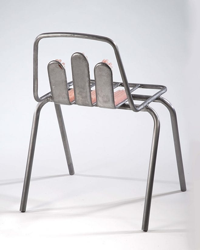 This chair draws inspiration from airport seating. This chair is intended to be placed in one’s home, and attempts to create a sense of comfort and stability within the realm of the temporary and the in-between. Mild steel with powder-coated finish.