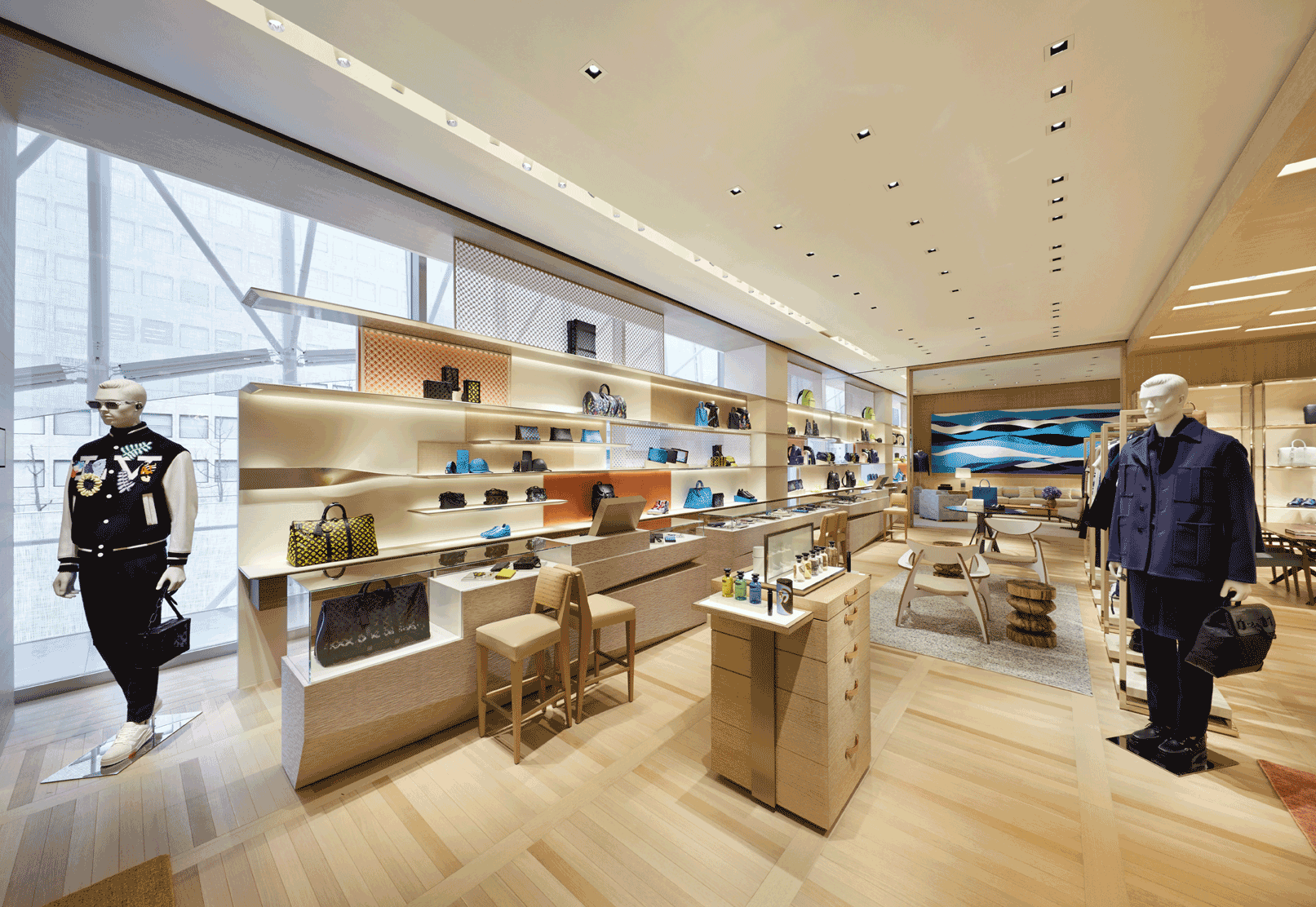 The ground floor is devoted to women’s accessories, while a mezzanine floor, dedicated to luggage and the Art of Travel, allows visitors to gain a bird’s eye view of the generous volumes of the main hall. Designed especially for the Maison’s opening, exclusive women’s products, such as a mink hoody, blue sapphire Tambour watch, and B Blossom necklace make welcomed appearances around the store, while a complete offering of women’s ready-to-wear and accessories by Nicolas Ghesquière, Louis Vuitton’s Artistic Director of Women’s Collections, occupies the third floor. The fourth floor is home to Louis Vuitton Men’s Artistic Director Virgil Abloh’s complete offering, where his exclusive designs from the Spring-Summer 2020 fashion show including a hoody and cargo pants, a Taurillon leather messenger bag and sunglasses rub shoulders with the permanent collection.