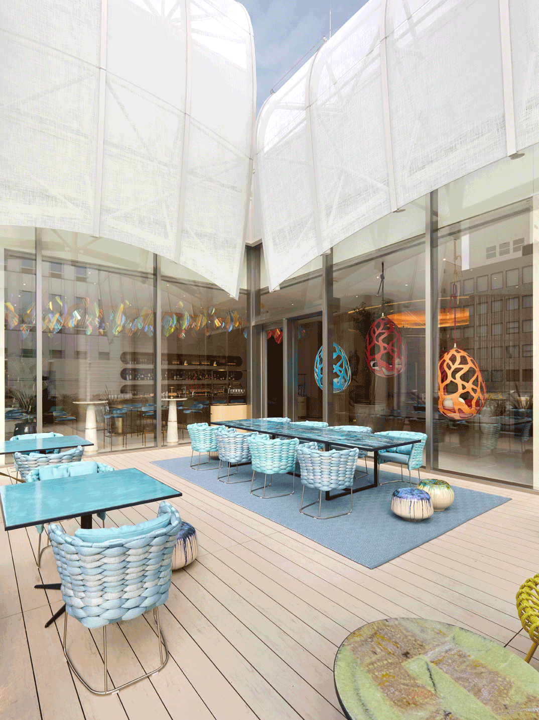 Throughout the Maison, Objets Nomades bring their colorful creativity. On permanent offer, they are placed to emphasize or contrast with the architecture, hanging down from the generous heights of the store’s floor. Launched in 2012, the Louis Vuitton Objets Nomades collection of designer travel and home-related objects keeps alive the House’s tradition of beautifully crafted travel-inspired pieces. Fourteen of the world’s most renowned designers, including Yoshioka Tokujin, Atelier Oi, and Nendo amongst others, have imagined 56 stunning Objets, which have then been made by Louis Vuitton. Sharing a sense of intuitiveness, desire, and pleasure, the Objets Nomades continue Louis Vuitton’s tradition of offering inspiring designs.