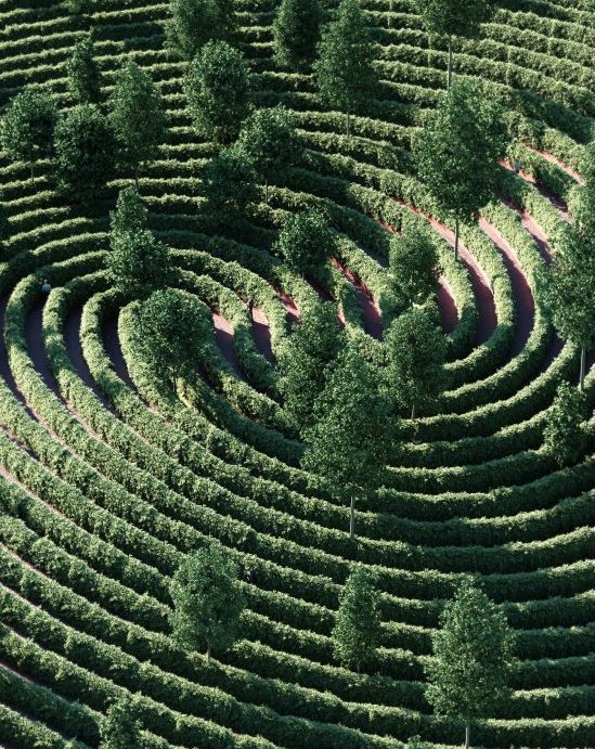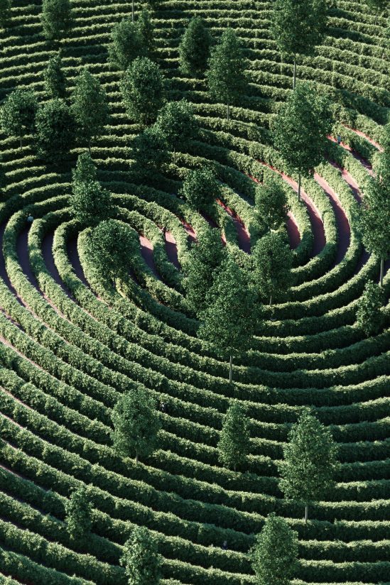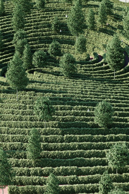 “Like a fingerprint, parallel lanes guide visitors through the undulating landscape. Every lane has a gateway on the entrance and exit, which indicates if the path is occupied or free to stroll. The lanes are distanced 240cm from each other and have a 90cm wide hedge as a division. Along their path, people walk on reddish granite gravel. Although people are visually separated most of the time, they might hear footsteps on the pebbles from the neighbouring paths,” he explains.