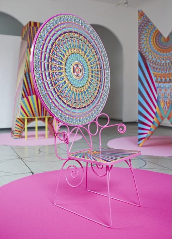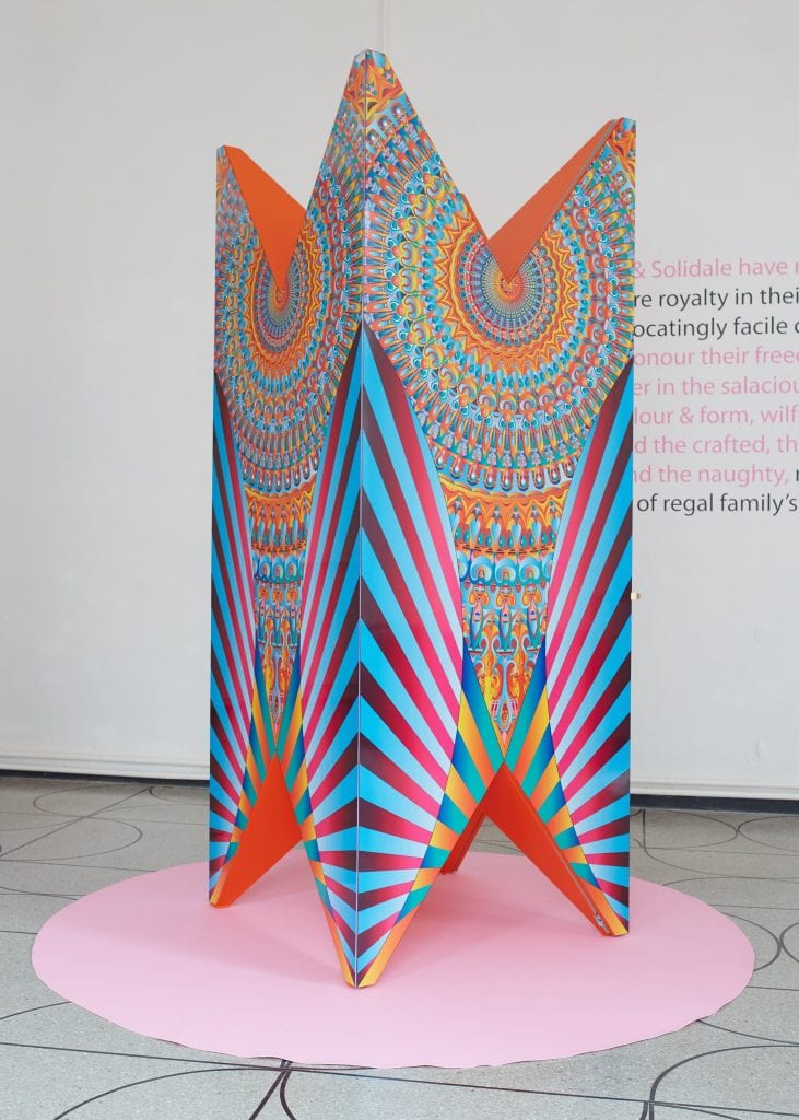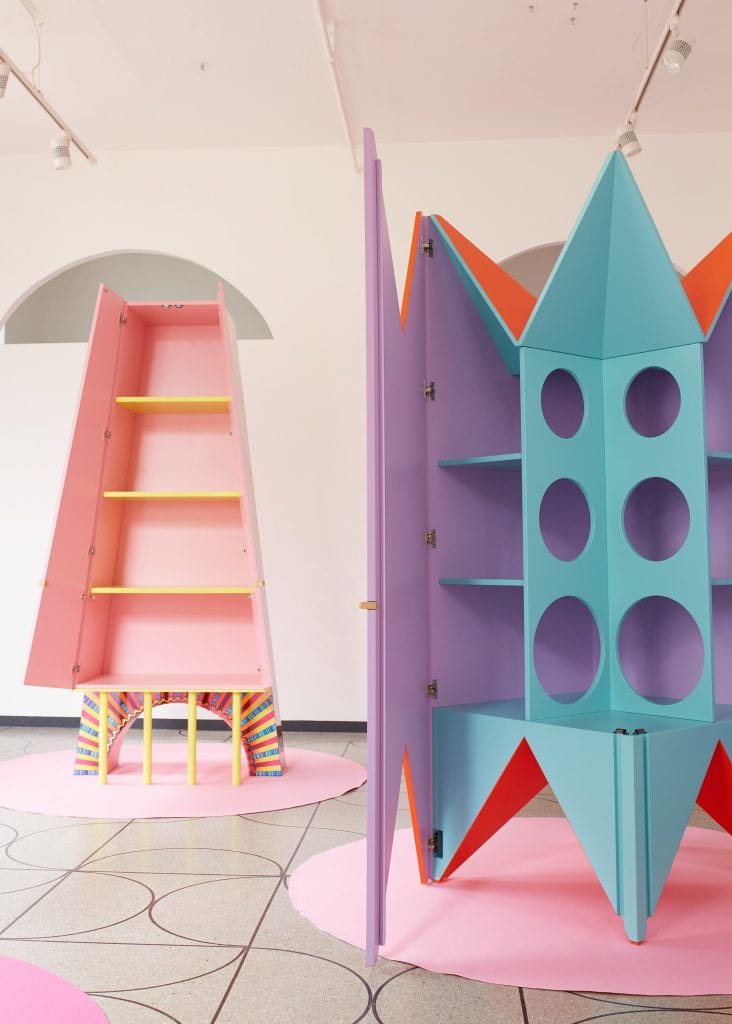 The Royal Family is a vision of the home as a court of domestic deviance played out through the ecstatic surfaces of a bourgeois’ nightmare. It models a 21st Century family of two parents and an insanely spoiled child where emotions and relationships can be played out in infinite possibilities. Gioioso (the chair), Benevolente (the wide unit) and Solidale (the tapering unit) have no official status, but they are pure royalty in total rejection to superficial codes of good taste and they honour their freedom and power in the union of sacred and profane, colour and form, willfulness and gluttony, the digital and the crafted, the new and the old, and the bad and the naughty, refulgent in patterns of a new kind of regal family’s aesthetic liberty.