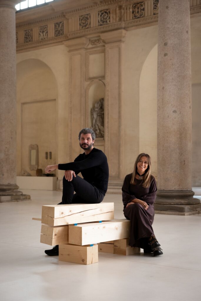 David hopes visitors will experience the exhibition as a journey. “What the first act wanted to tell were the material and stylistic elements, a sort of manifesto of the objects that will then be exhibited inside Volumnia. While on the outside the out-of-scale object in fir confronted in a chromatic contrast with the neoclassical marble facade, inside what awaits the visitor will be a path that will bring him closer to the less formal values of the project such as silence, and slow and meditative time, exploiting the synergy between the project and the majestic spaces of the church of Sant’Agostino.”