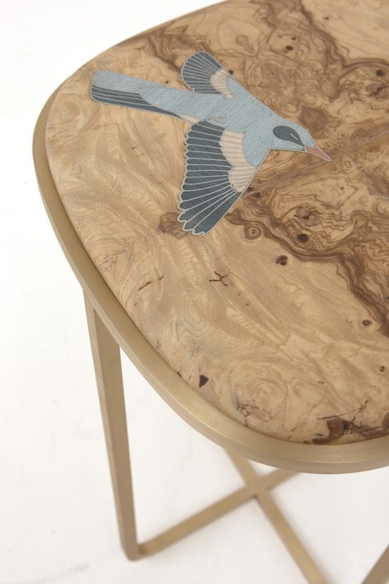 “The collection reveals the many patterns in nature, from a full-fledged eco-system comprising of birds, insects, and trees to the geometric patterns that I always use in my work as well as the beautiful patterns of the wood grains themselves,” says Nada.Patterns in Nature occasional tables