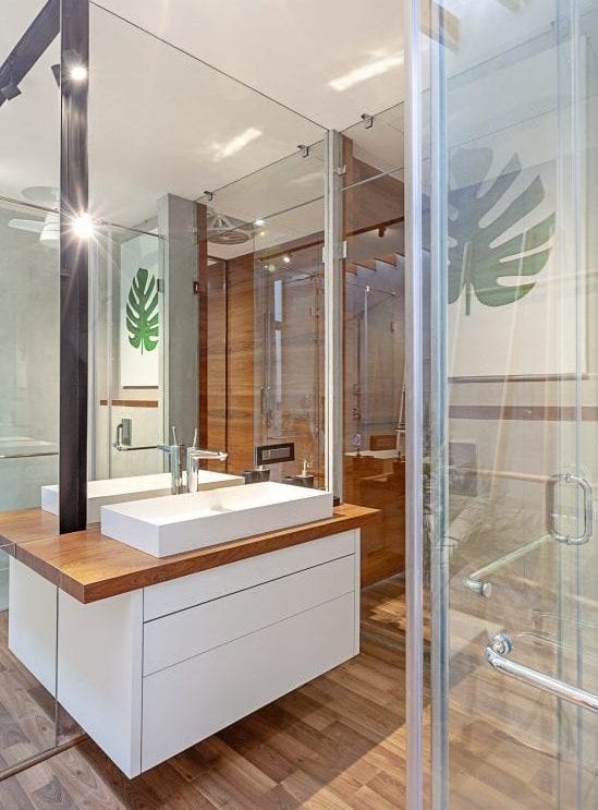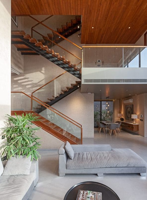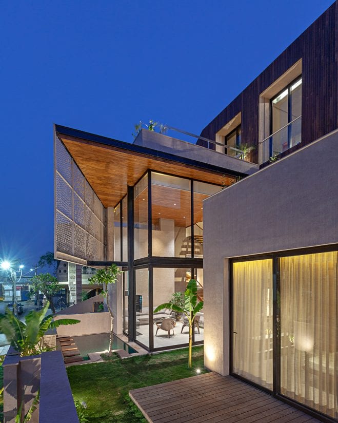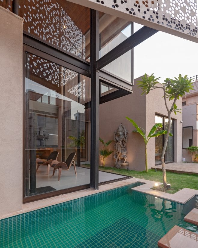The architects conceptualized an open dining and living area. The living area is a double-height area with the ceiling continuing through from the inside to the outside; its L shaped openable windows connects to the courtyard and waterbody. The kitchen doors completely slide open onto the dining room as per the occasion. The dining, kitchen, living, and garden form a public area that looks very different at night, with mood lighting and a waterbody, landscape and a beautiful, authentic and traditional wooden sculpture.