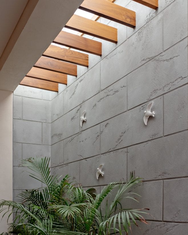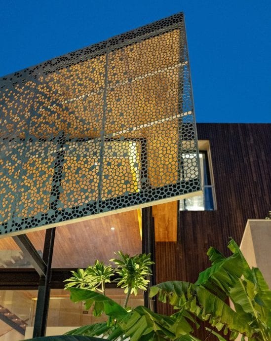 In a city where temperatures routinely exceed 40 deg Celsius, the filigree screen is both functional (protects from the sun and offers some privacy) and aesthetic, a reminder of the traditional jallis of the region. It looks spectacular at night, and during the day it cuts down the heat and glare while reflecting on the windows. From the first landing you get a feel of the double-height, of the expanse and a new angle to the screen which gives the villa its character: combines the past (through the use of jallis) with a feeling of modern, clean lines.