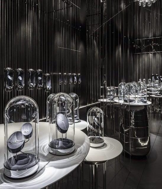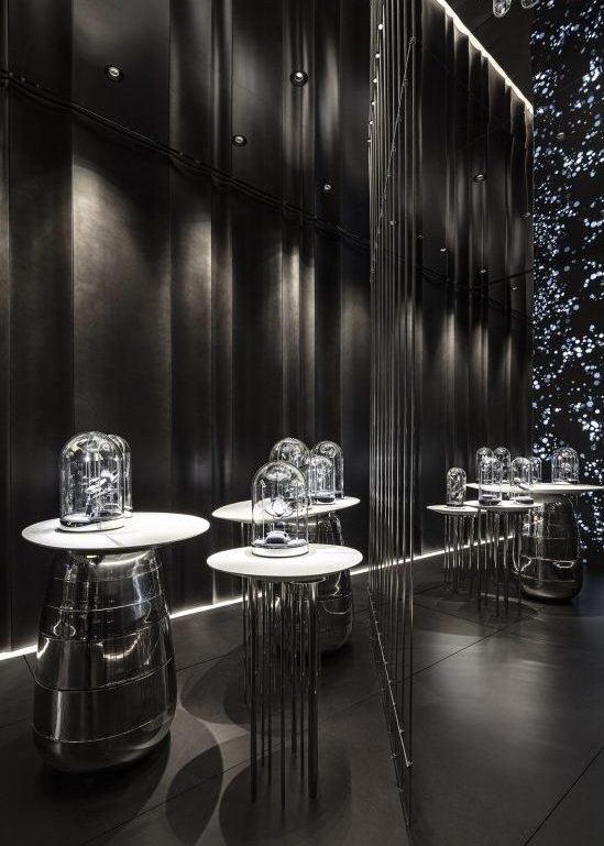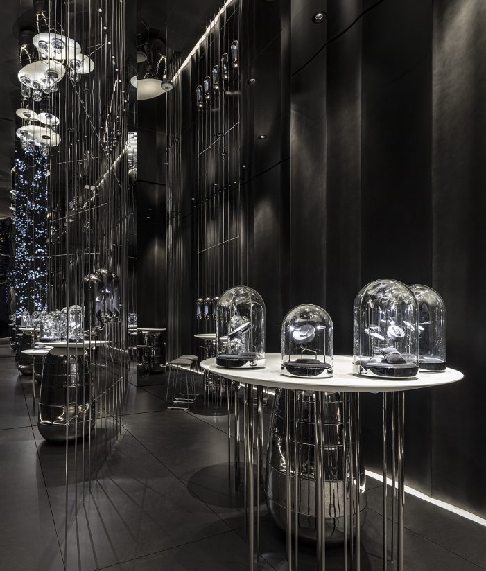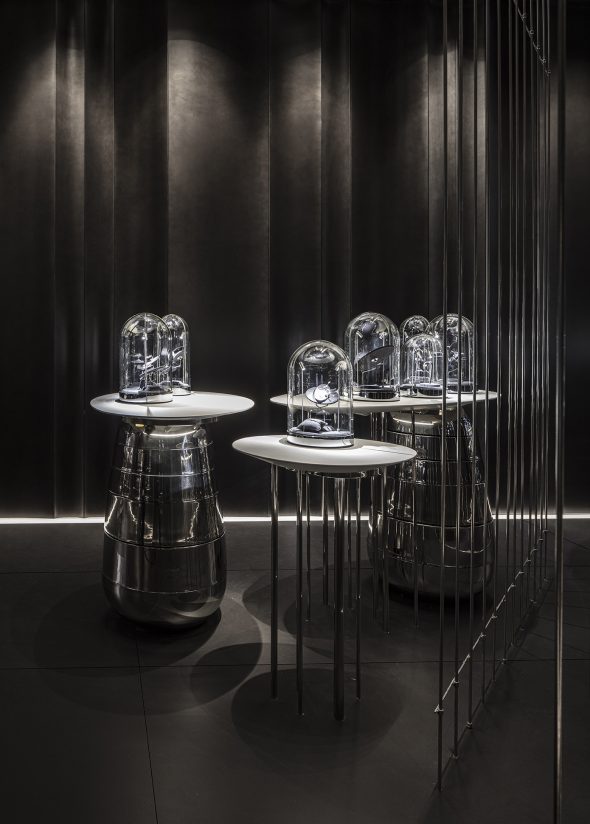 The store is inspired by both values, introduced in a subtle and abstract fashion with ample room for interpretation – it’s a very informal yet emotional and holistic retail experience. The forest informed the spatial quality of the store, while the culinary world inspired the intimate and personal moments while engaging with an object of desire. Contributing to that moment of magic are the cloches with their tech-driven opening mechanism – the two glass spheres slowly open, allowing for the jewelry to be served.