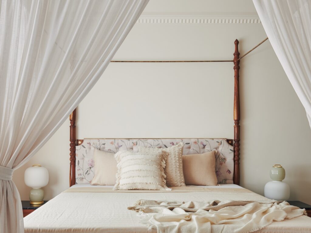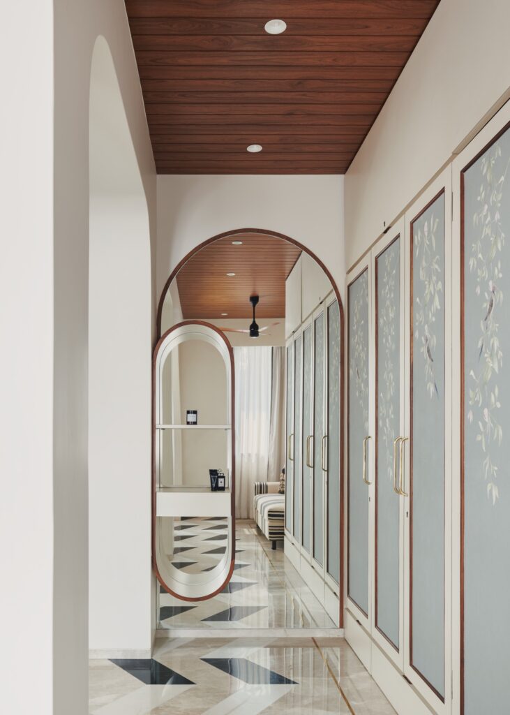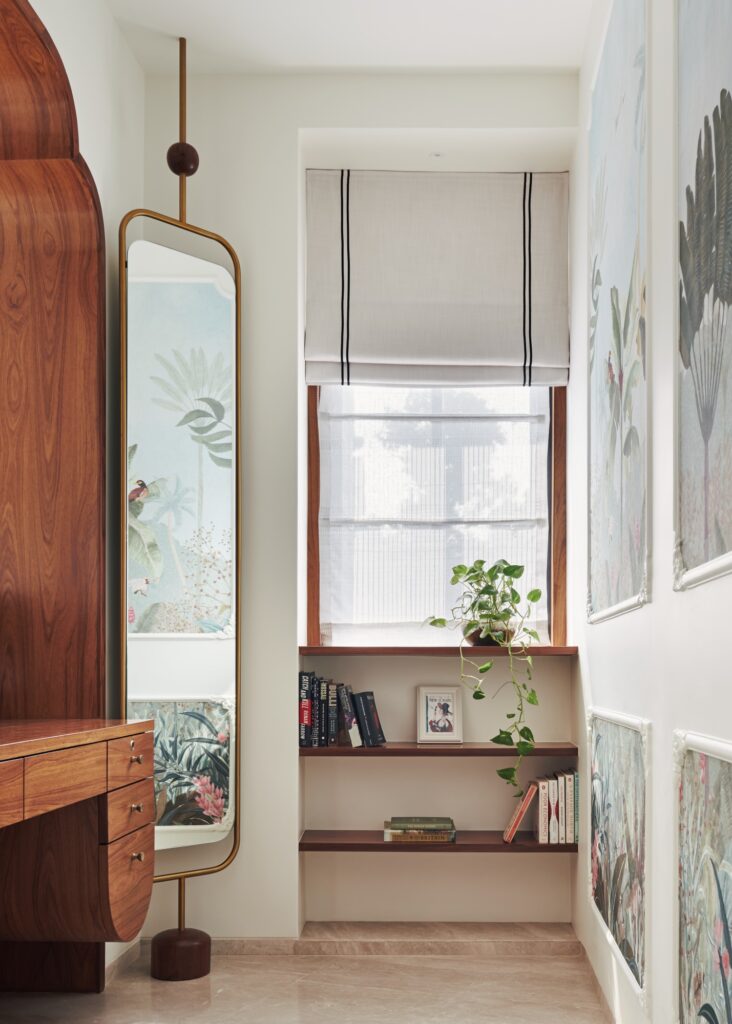 The large framed panels of tropical but yet subdued Kalakaari Haath wallpaper in the entrance area give a backdrop to the bed, and are strategically placed to seem as if they are framed by the wooden arch when viewed from the foot of the bed, giving the room a distinctly feminine vibe.