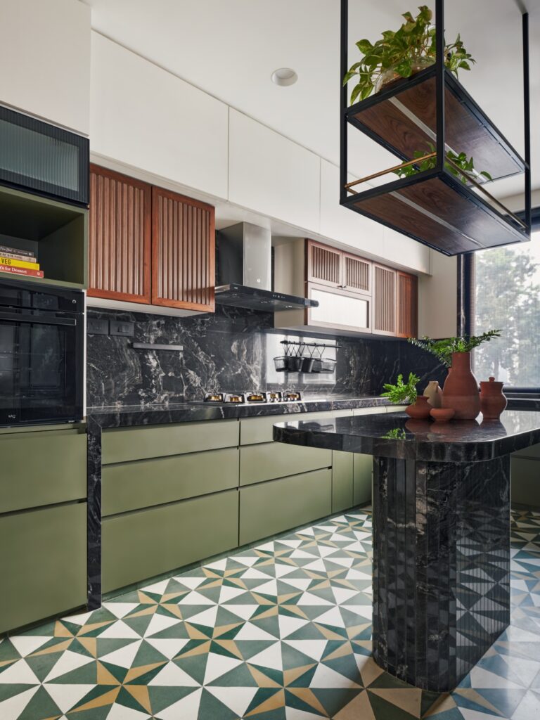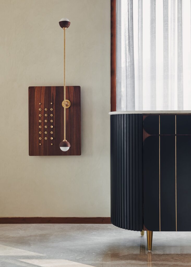 The olive green, black and wood used in the furniture are echoed in the geometric design of the floor. The corridor is utilized to make the most of every bit of space – there is a prayer room to one end, a utility and store room as well as an intimate study concealed behind a wood, cane and fluted glass partition. Subtle grey and pastel tones of Kalakaari Haath wallpaper offset the warm wood and brass of the furniture and set the softer tone of the rest of the private quarters.