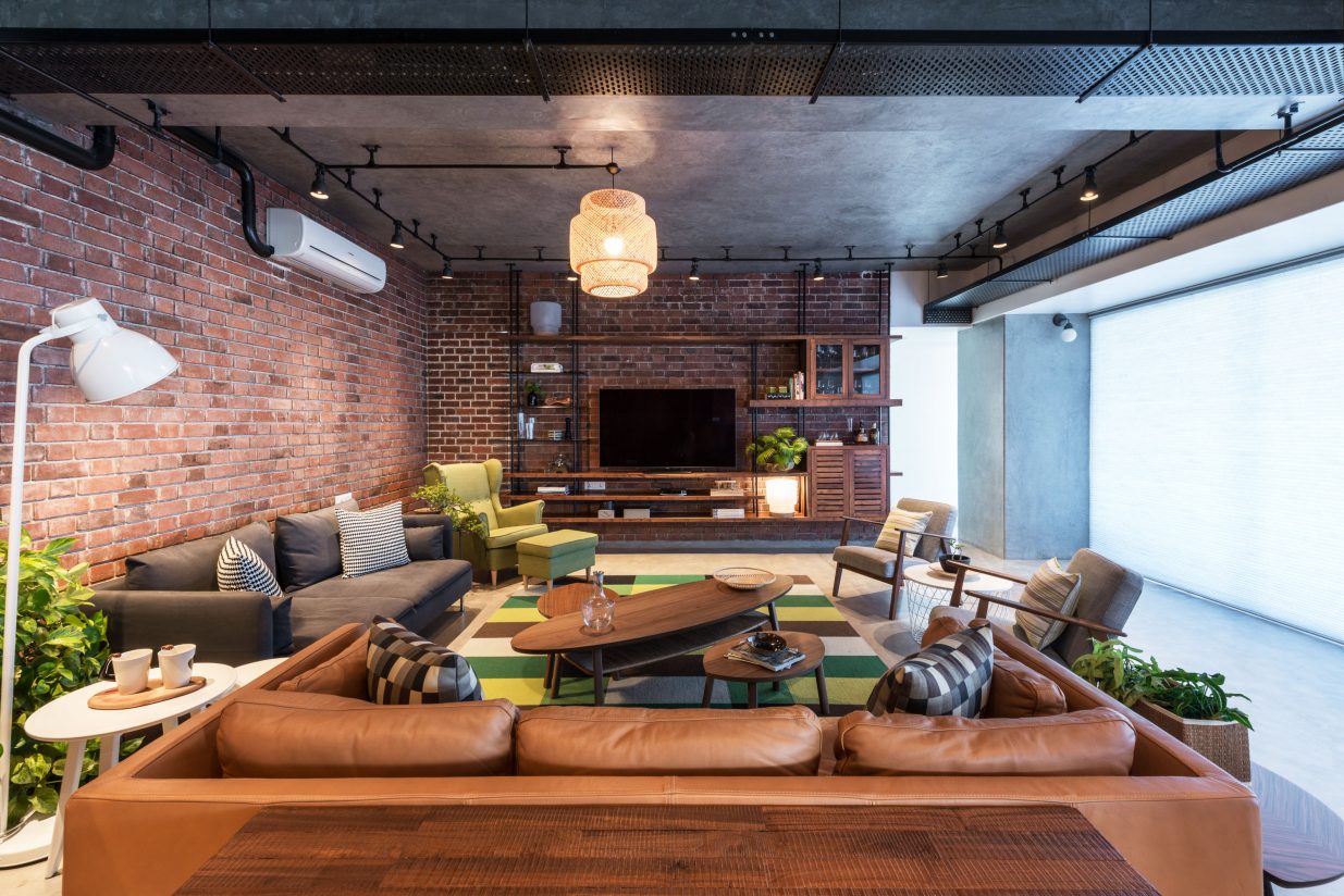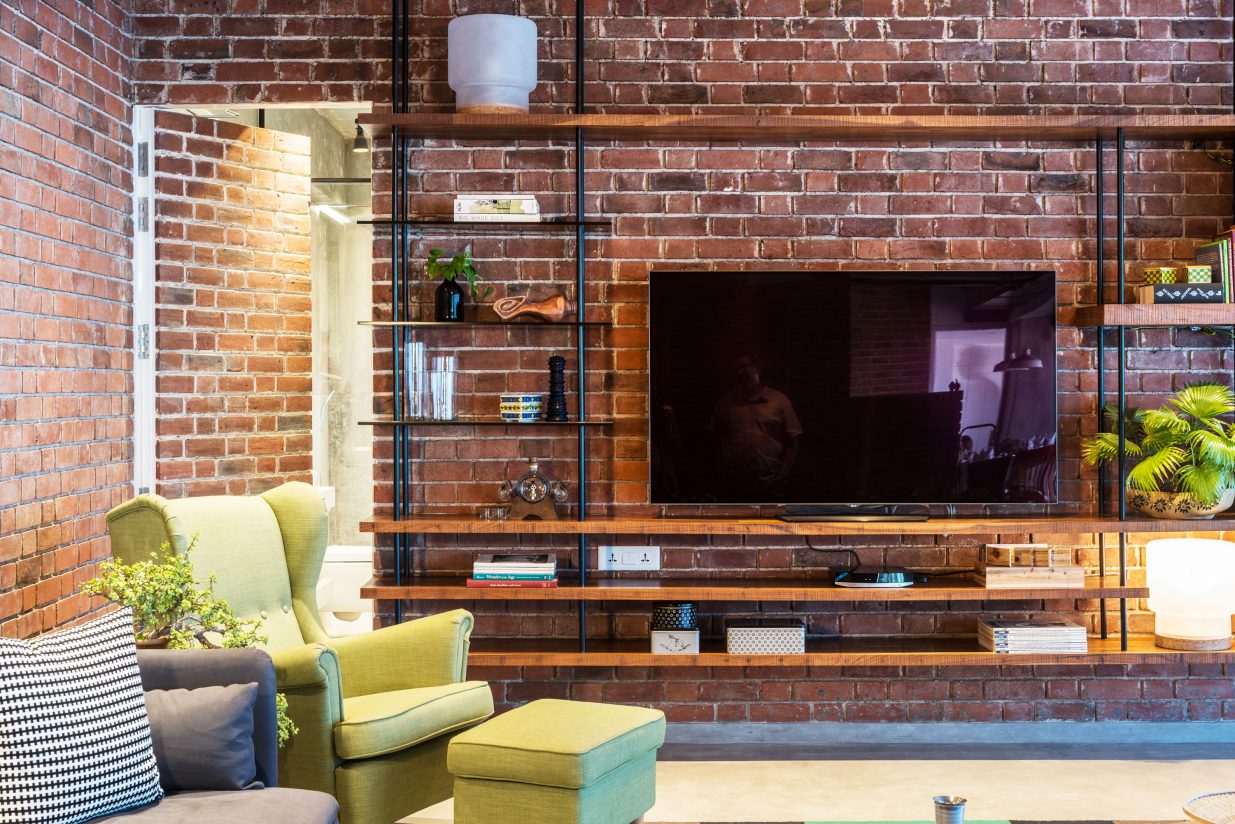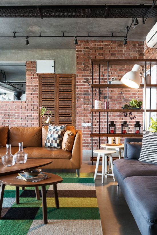 “The clients wanted something completely different. And we were ripe for the challenge. Thus, the interior was conceptualized to highlight the raw materials in its original form, texture, and color. We used industrial features and combined them with clear geometry and raw materials like bricks, concrete, MS and wood to create a raw, bold look. We further added colorful furniture, art pieces and light grid solutions to balance the visual consistency of the space,” explains the architects.