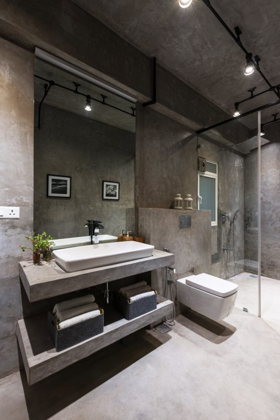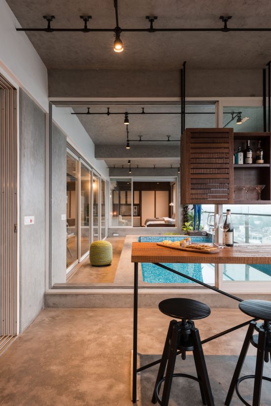 The client was open to the idea of having the imperfections of an IPS flooring with hairline cracks. Therefore, except for the mosaic in the pool area, not a single tile was used in this project. Concrete plaster was majorly used in the apartment for the finishing of walls, columns, and ceiling. Open area with sliding Aluminium doors allowed each area to interact with the others for a more spacious and carefree aesthetic. Curtains have been used to accommodate privacy when needed.