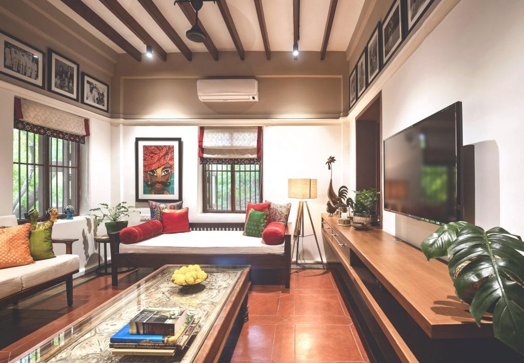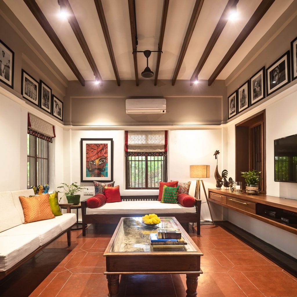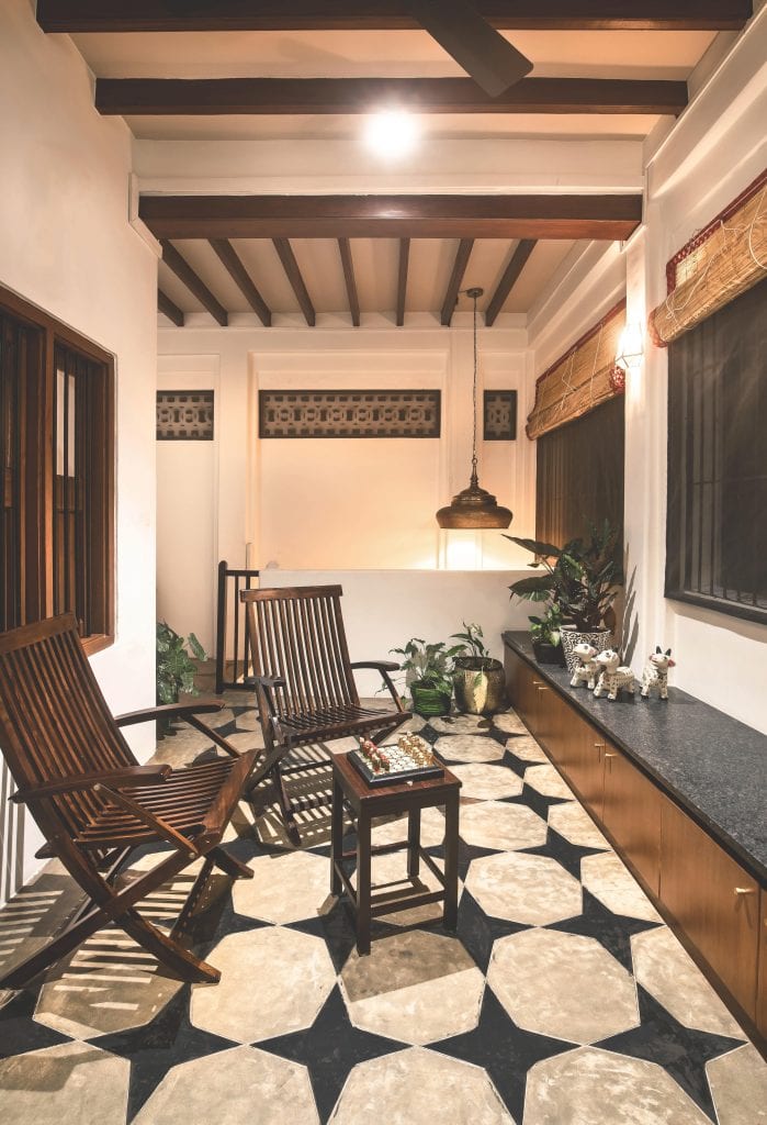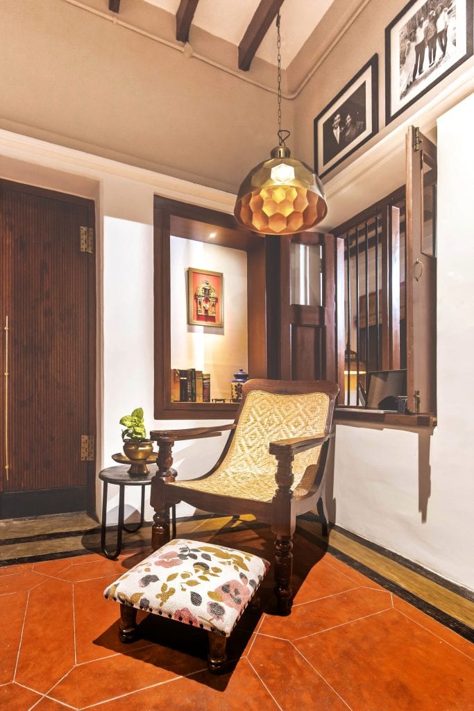 The addition of a perforated screen divides the long corridor-like space into a living room and a vestibule. The living room now with an added layer of privacy is adorned with elements typical of a South Indian household. Most of the upholstery for the curtains and the cushions were sourced from traditional Silk sarees. The furniture has been sourced from antique shops so that they blend in with the period style of the residence. The top portions of the walls have family photographs, framed in the black and white reminiscent of yesteryear images.