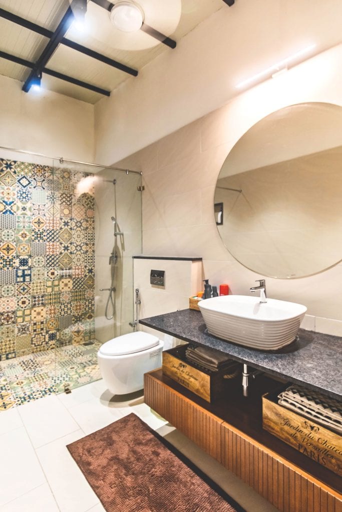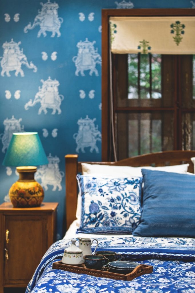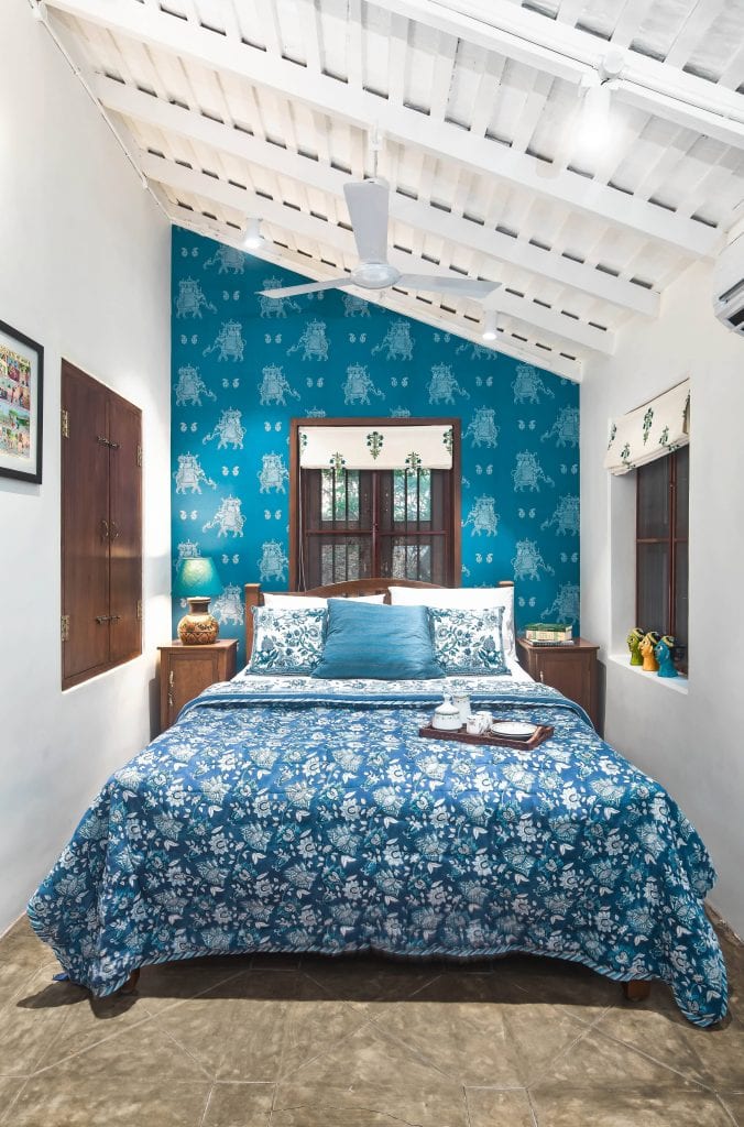 The cozy vestibule is transformed into a study space with a comfortable corner and a plantation chair to relax in. A unique double fold wooden door detailed with vertical grooves and custom made slender brass handles leads to the bathroom which takes everyone by surprise. This treatment was necessary to not draw too much attention to its awkward position in the center of the house. The Bedroom, small yet cozy defines this space. The blue of the ethnic wallpaper in tandem with the carefully selected upholstery contrasts beautifully with the sloping terracotta tile roof.