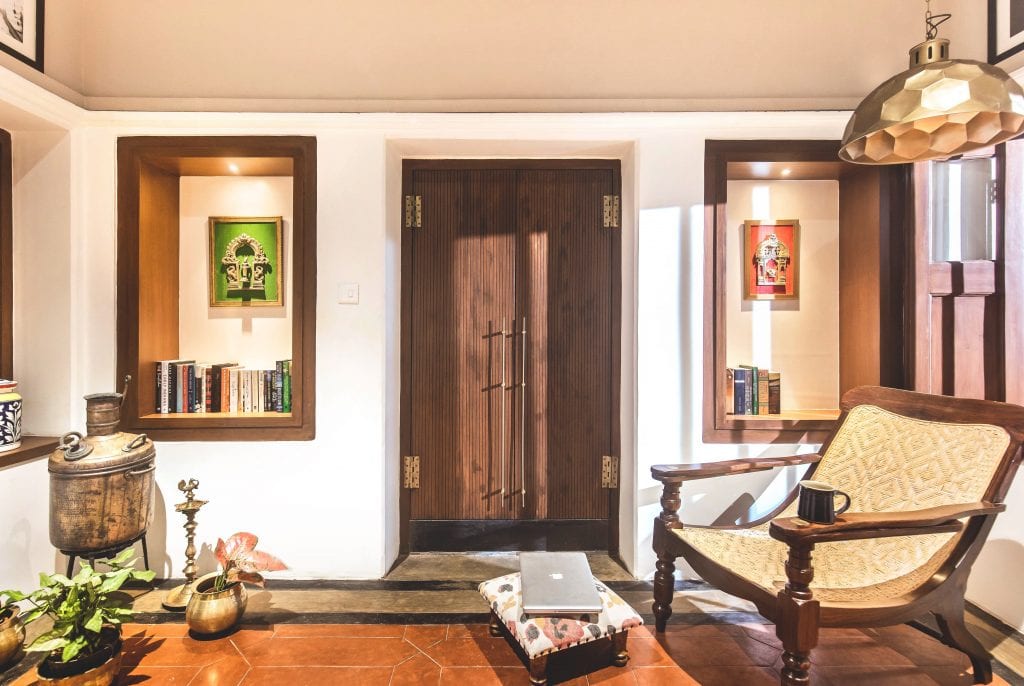 The thinnai / verandah of an ancestral Madras home acts as a transitional space between the outside and the private space of the house. A long shoe rack along the expansive openings of the North East façade of the residence doubles up as a seater. This, along with a couple of armchairs, becomes a lovely spot to enjoy a cup of tea in the early morning light or social space in the evening for the family to gather together.