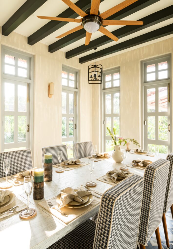 Wanting to create a ‘pause’ between the living and dining areas, Amey chose to use landscaping to separate the areas, and effectively create what would be the highlight of the villa –  the dining room which was conceived as a ‘floating zone’.  Ensconced by large mullioned windows on two sides looking out onto the courtyard beyond and gives the impression of a room completely surrounded by nature and cut off from the rest of the house – an island, a peaceful sanctuary where the family can gather at mealtimes, feeling cut off  from the chaos of the world around.