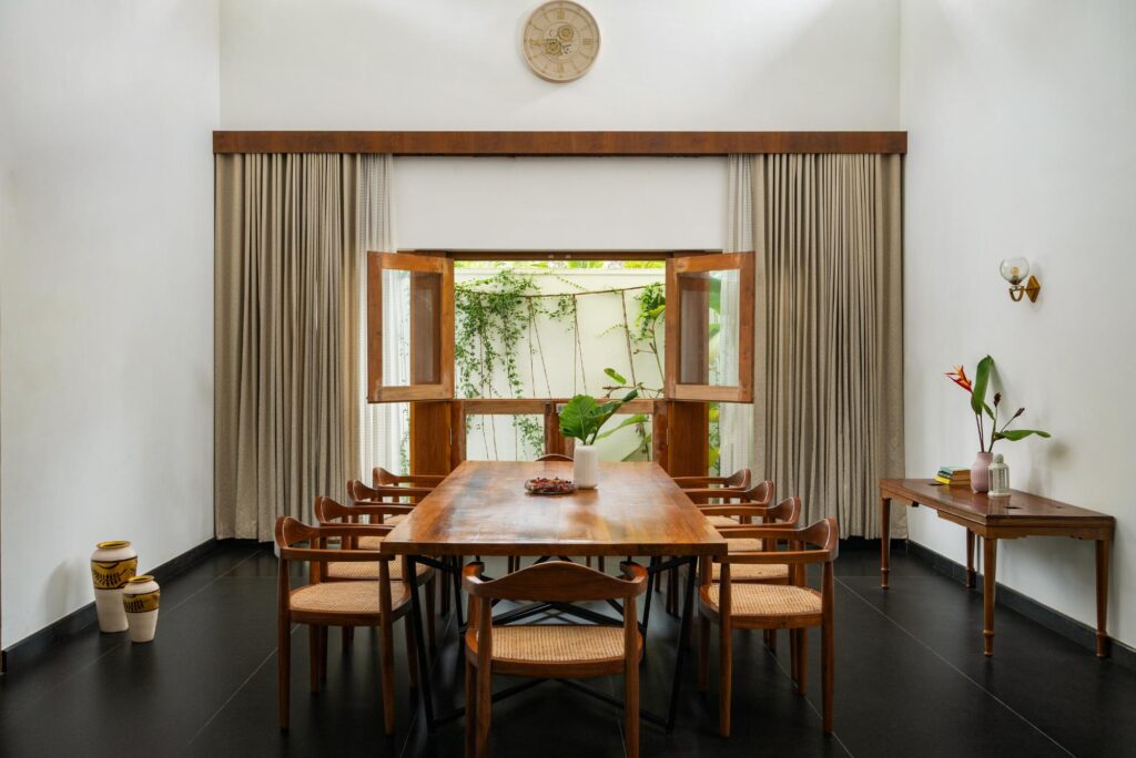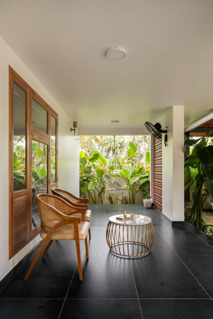 Shaded verandahs and deep overhangs mitigate heat gain and protect against monsoon intensity, and filtered daylight reduces glare while maintaining luminous interiors. The breathable palette – stone, lime-based finishes, hardwood- responds naturally to humidity, allowing surfaces to evolve rather than deteriorate. Sustainability here is not technological excess, but material intelligence and climatic sensitivity.