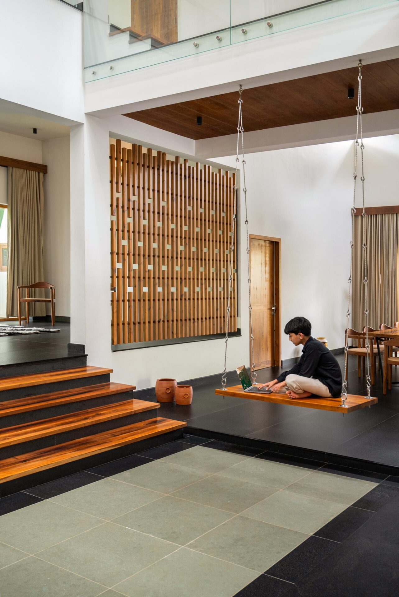 Balancing interaction with privacy, the bedrooms are positioned as quieter retreats along the periphery. Transitional thresholds, subtle level variations, framed openings, and intermediary spill-out spaces maintain visual continuity while ensuring acoustic and functional separation. Pinewood trellis work further modulates privacy without severing the connection. Children can engage in projects, others can read or cook, yet remain visually linked to the home so that the atmosphere is one of togetherness.