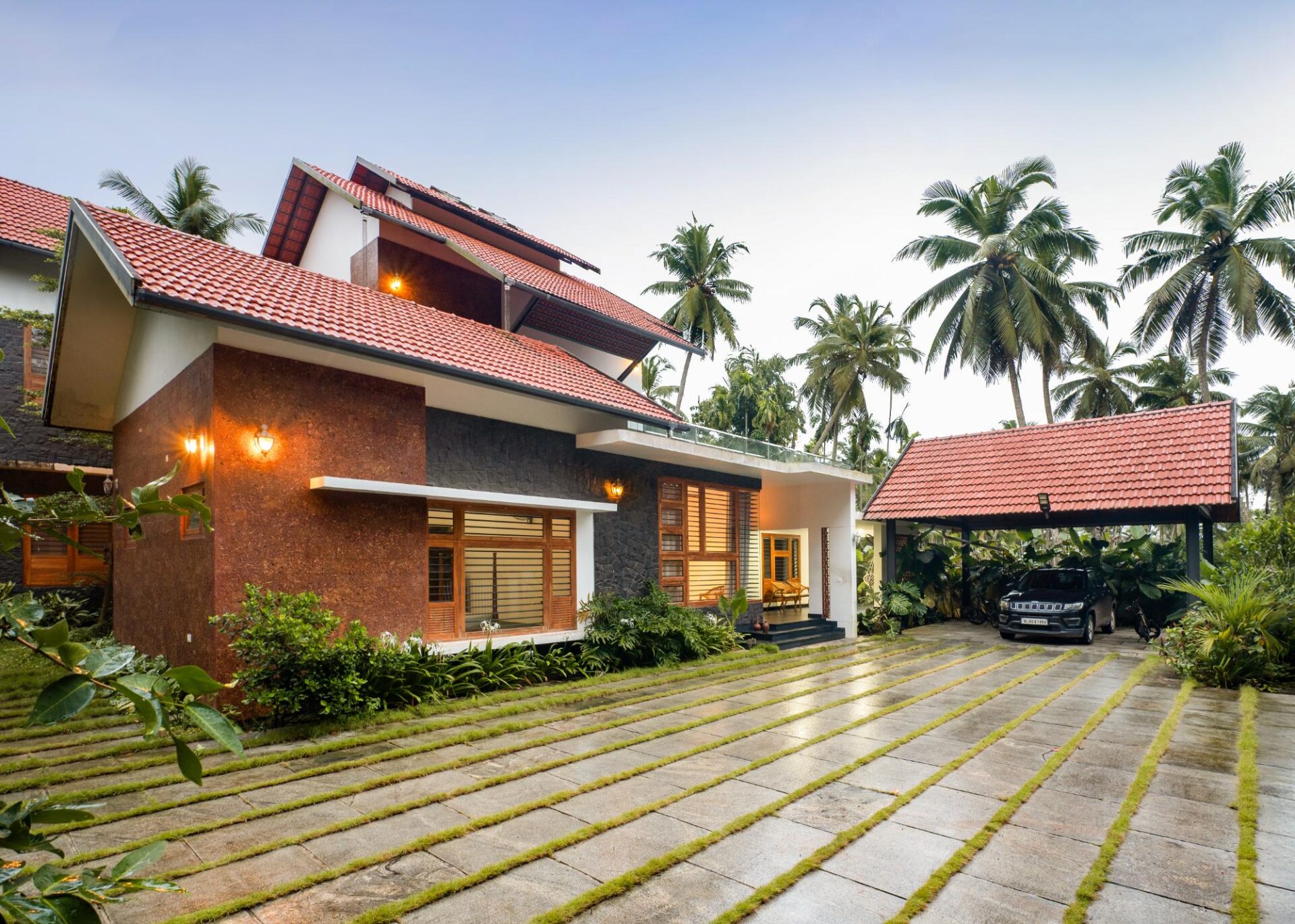 River-washed granite and Kota stone, along with other materials, were chosen so that the material ecosystem remains cohesive and regionally grounded, with most resources procured from within Kerala to reduce transportation impact.