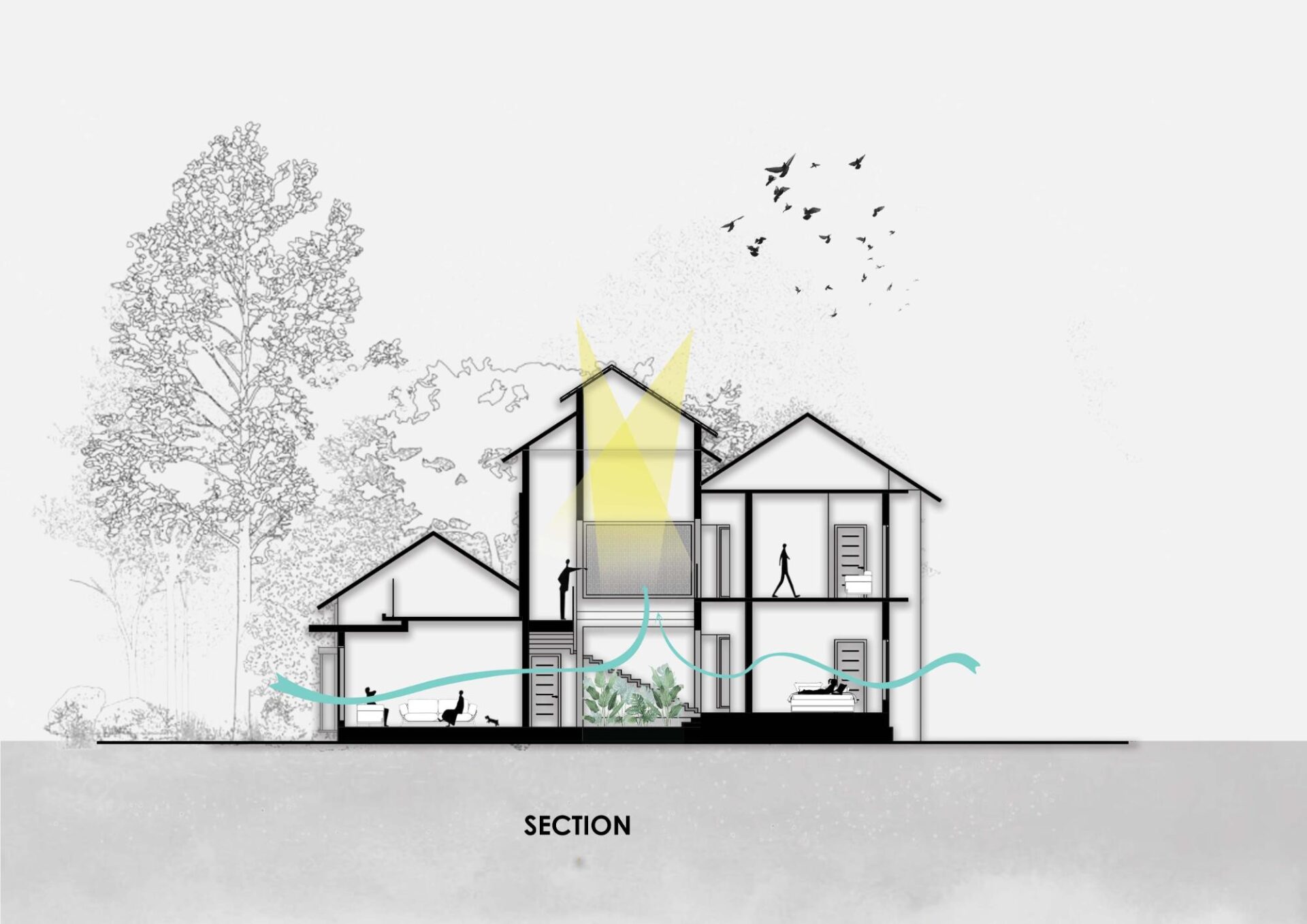 Movement progresses through framed views, shaded patio-like spaces, and semi-open passages that constantly reconnect occupants with greenery, sky and stone surfaces. Visual axes are deliberately aligned to create pauses, moments where the landscape becomes integral rather than incidental.