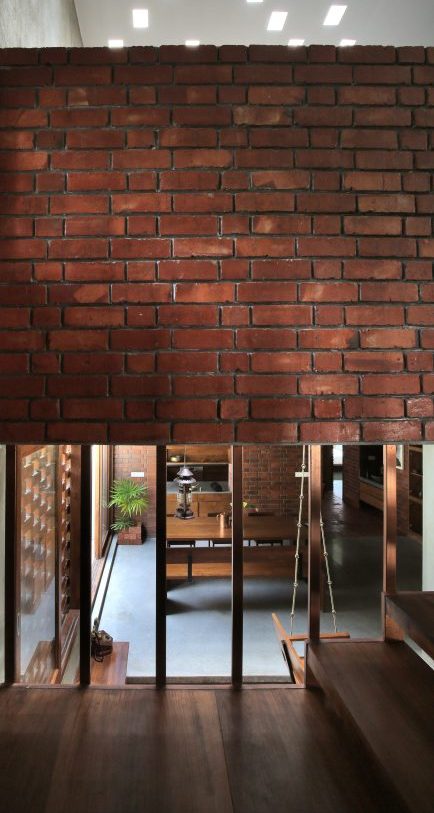 There is a dynamic play of light and volume when one enters the house – the Jali work, the louvered gable and the sky light help achieve this. The sky light creates an ever-changing pattern of light which gives the resident, a unique experience at different times of the day. “Working with exposed brick in itself is a great challenge – a delicate balance between brick work and exposed concrete is important for the aesthetic balance and beauty of the house. A very open plan called for minimum support walls and pillars inside. The hierarchy of spaces was carefully handled. We tried to bring nature in while giving maximum importance to privacy by using jali work for good air flow”, says Srijit Srinivas, main architect of Srijit Srinivas – ARCHITECTS.