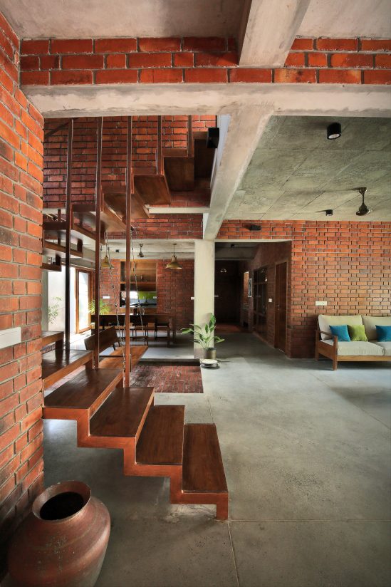 “The brightness and warmth inside and outside the house is achieved with no artificial colour at all – it is achieved through the natural colours of building materials like – brick, concrete, plastered wall, wood veneer, natural light etc,” says Srijit Srinivas, main architect of Srijit Srinivas – ARCHITECTS.