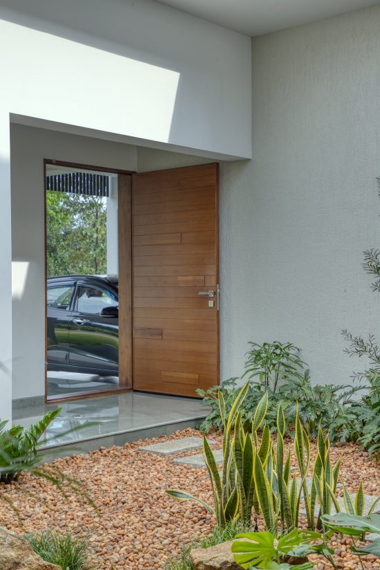 The site is encompassed by the family-owned lush green rubber plantation which is located a few kilometers away from the town of Kanjirapally. The approach is along a private road that slopes up along the site as one gets closer to the location. The location of the house is at one of the highest points of that site and renders distant views of the nearby mountains from the foyer. The house is set back from the entry point that allows a large foreground and a well-designed green space. Making the true focal point the setting of the site rather than just the architecture.
