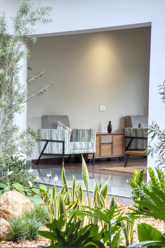 A noticeable feature of the location is the chirping of birds that echo throughout the day. The clients wanted these sounds to be the background of the story of the house. Hence, a design that revolves around the surrounding nature was adopted. The openness and free-flowing surroundings were incorporated into the planning, making the house a blend of the exterior with the interiors. Hidden in the exterior elevation, a courtyard was planned right at the entrance to the house. To see a portion of the sky while being indoors is a key takeaway from these beautiful interiors.
