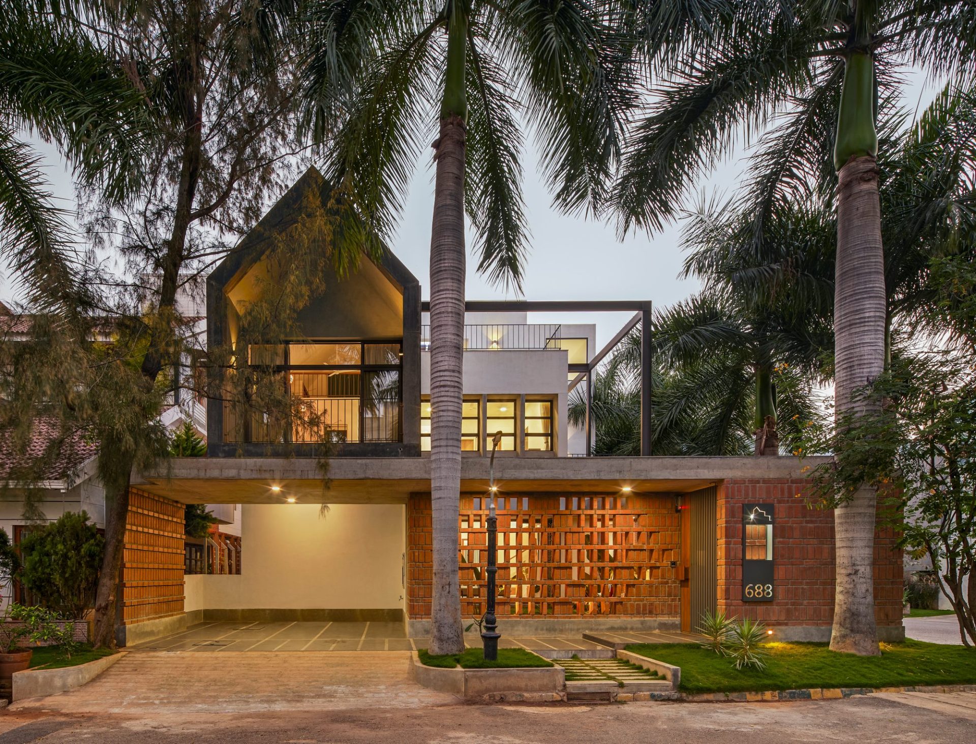 The Cuckoo’s Nest is designed to be a sanctuary intended to resonate with the silence and quietude of a temple complex, yet be filled with the sounds of conversation between three generations. It is built on a corner plot measuring 45’x75’ with roads on the western and northern edge in a gated layout and surrounded by a silver oak tree and some palm trees.