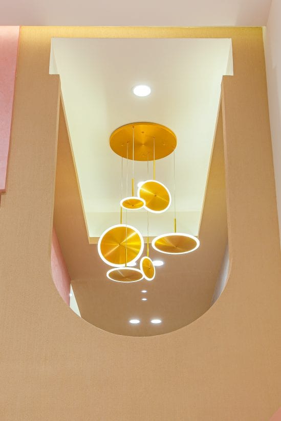 The first thing that sets the tone for the interiors is the rich colour scheme that is used, the attention-grabbing pink and gold combination fits the narrative to a T and when used together, an elevated sense of luxury is created which is also synonymous to this interior space.