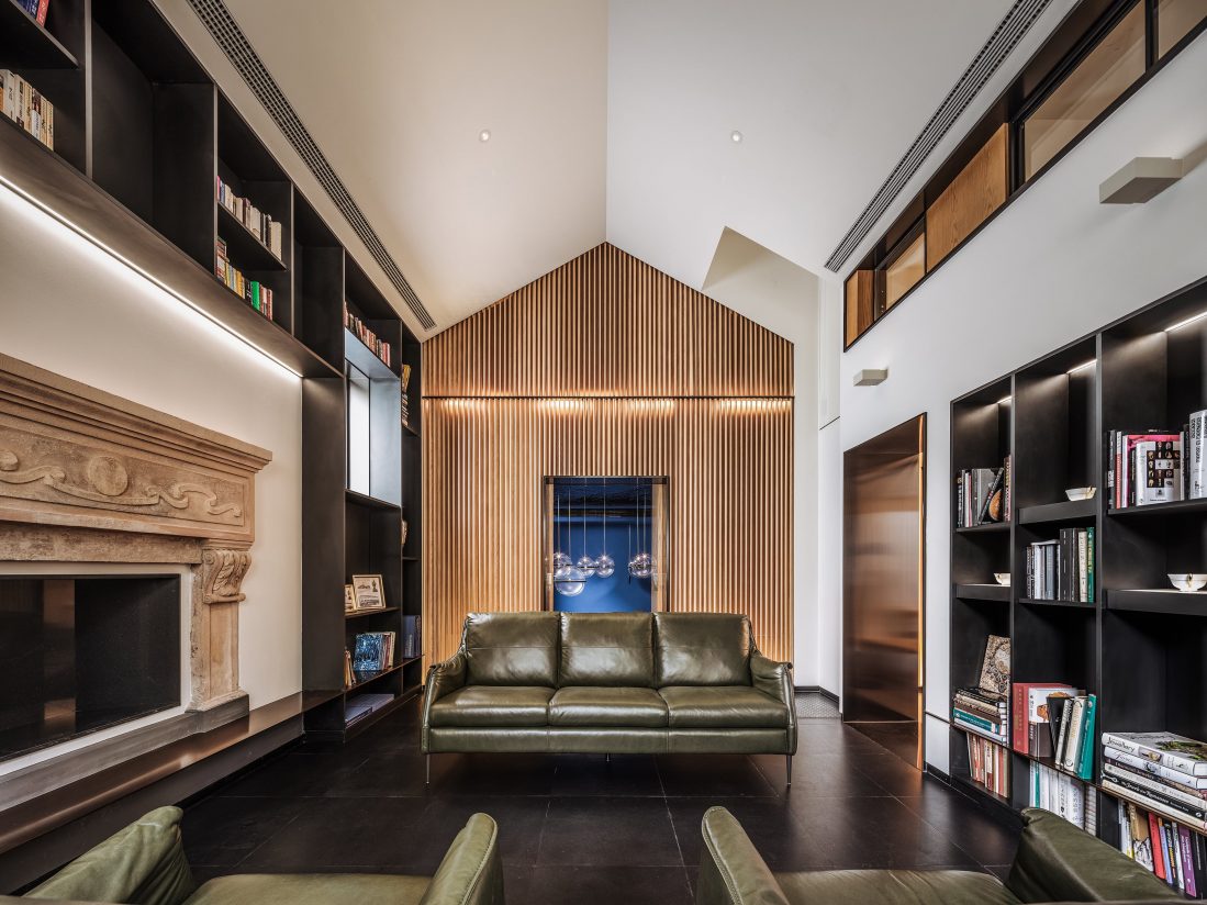 The living room, which is also a library, has a ritualistic purpose and is connected to the views through the window. The black bookshelves exhibited the clients’ collection but limit the living room’s view. An elevator connects the living room to the mezzanine space.