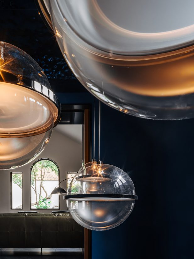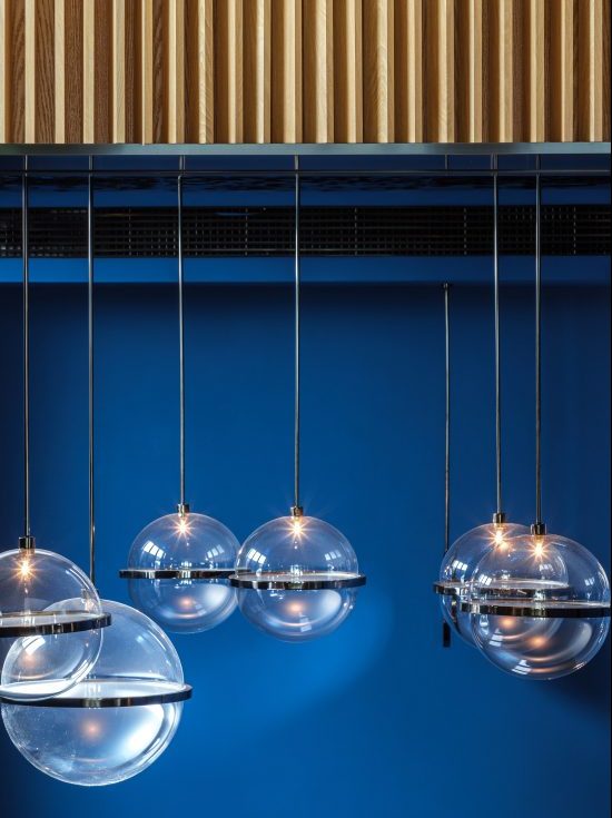 The mezzanine space belongs to the male client. The dark private space is now connected to the living room, bedroom and hallway through a window. The peeking experience relates back to the designer’s experience to the John Soane Museum. The woman’s room has a silvering blue ‘galaxy’. Each ‘star’ is a customised exhibition shelf made of clear acrylic. This is a miniature version of the bubble installation in a restaurant designed recently by Wutopia Lab