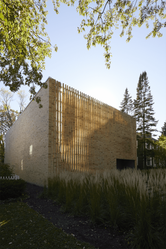 This seemingly modest courtyard house in the suburbs of Chicago designed by Brooks + Scarpa with Studio Dwell is wrapped in vertical twisting columns of brick, creating an arresting pattern that appears to be in motion and is an experiential design that examines the connections between form and material.
