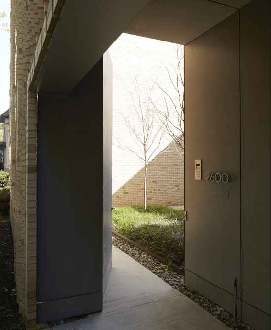 The home is fronted by a small yard filled with tall prairie grass. A diagonal pathway cuts across the yard, leading to a recessed entrance. Visitors step through a threshold and then traverse the courtyard to reach the front door.