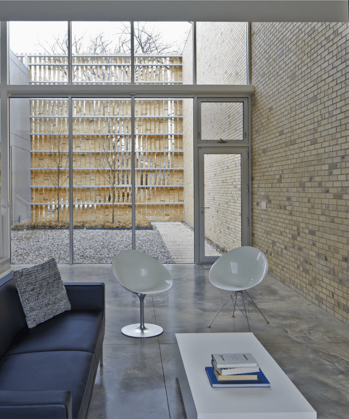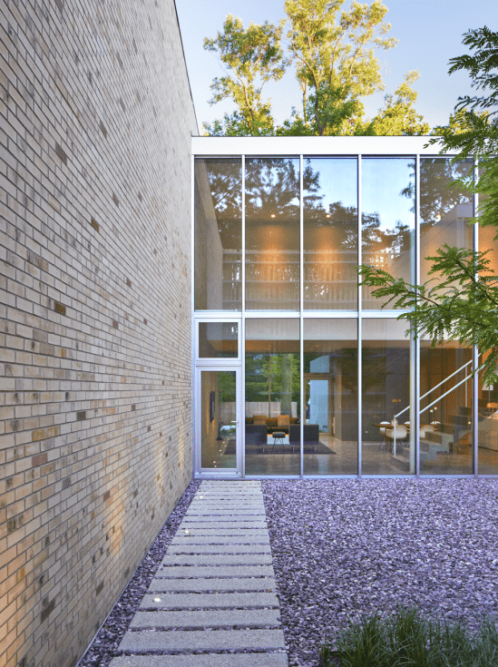 Located within a few blocks of the campus of Northwestern University in the suburbs of Chicago, this modest-sized courtyard house is wrapped almost entirely in brick.