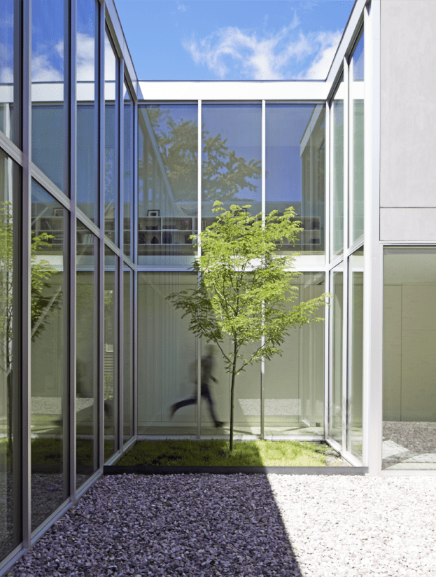 Throughout the dwelling, glazed walls provide views of the courtyard and usher in dappled light.