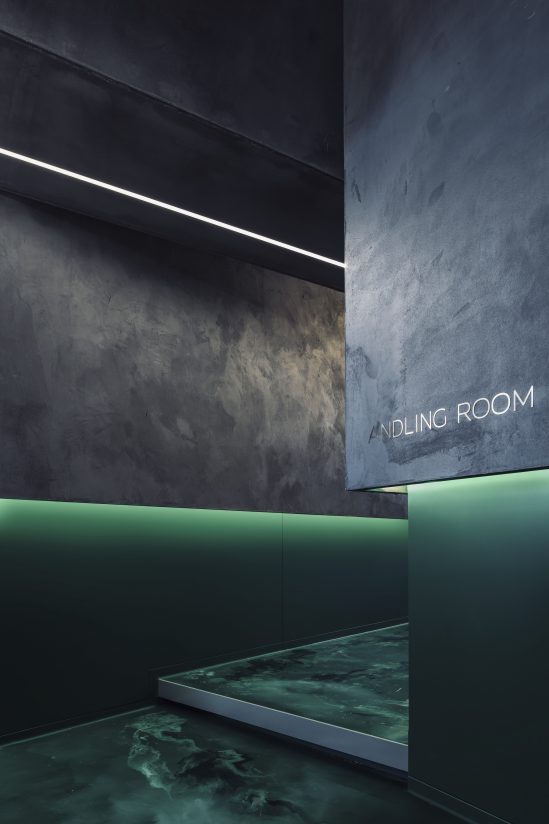 The entire space is in a dark shade of green, which is the colour of the logo, and the resin floor paint features Chinese ink painting making the floor exhibit a green aurora that is projected by the box. Process modules are displayed in the central area of the exhibition hall. To make sure that the lights from different wall lamps do not intermingle and every wall light can be displayed on its own, the walls have a slight inclination. Breaking the traditional method, the front desk integrates service area. A slanted front desk area was built in conjunction to the perspective of main entrance. And a logo wall of Lupard was made in the end. The shape of logo is a combination of metal and blocks, in which the three-dimensional effect of strength and dynamic tension represents the spirit of Lupard.
