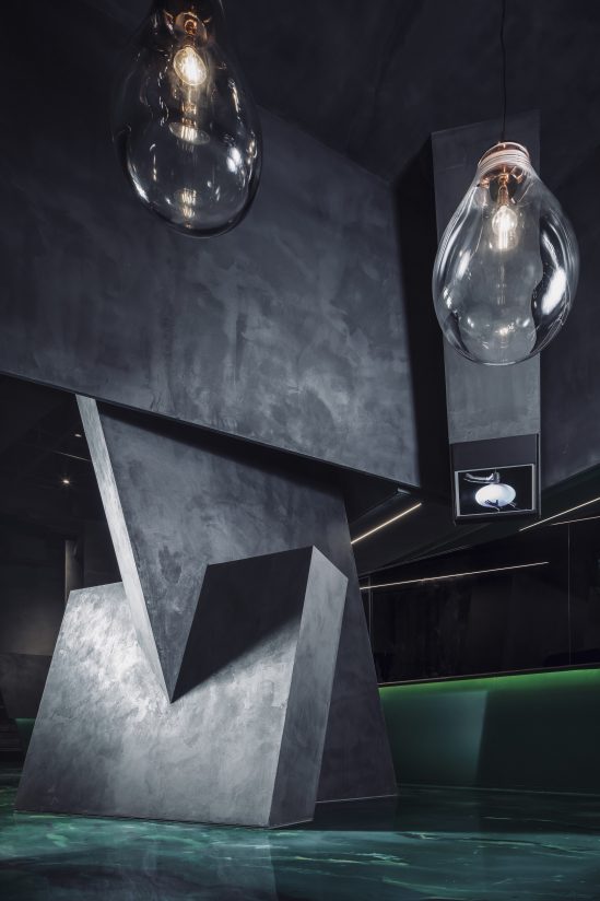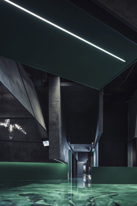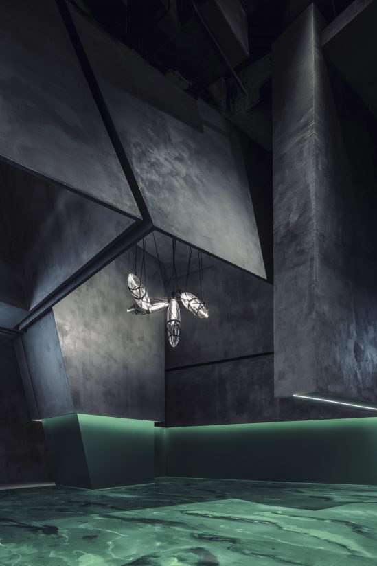 Intense settings, aluminium plates floating from above, shiny green resin flooring featuring Chinese ink paintings and concrete art walls, all working together to shine light on the light fittings. That is the elaborate set design that Cun Designs, an integrated design team of diverse professional, avant-garde and young designers, has created. Working at the integration of architecture, space and time, this team believes that design has no limitation.