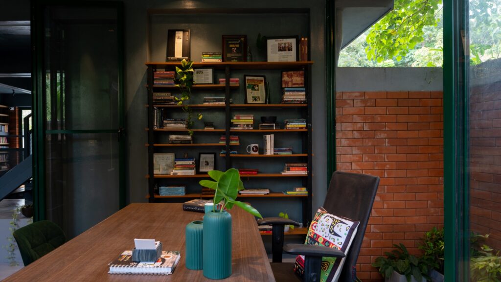 “She said it would be nice to allow glimpses of the rows of books through the windows, like one would see into a house when passing by,” Anavadya recalls. The first floor has a semi-private space for studying/co-working and a room for events. One wing on the same floor also has a bedroom and attached bathroom for Archana to catch a breather on the days when TRR has back-to-back events.