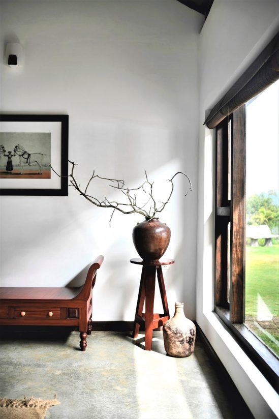 A handsome Kerala teak door adorns the entrance; the famous trunk less elephant sitting beyond the landscape is an antique. The owner purchased the door and artifacts from an old manor house near Mattancheri, Kochi, the haven for such treasures. The benches were custom-made by Humming Tree’s carpenters. The tall floor stand mirror was a gift from a dear friend; the photo frames on the wall are from Mysore. A wooden deewan along with three-legged high stools sits opposite a durable carved wooden coffee table with brass hinges; a Wabi-Sabi style rustic pot, acid finish glass vase, and vintage Moghul painting, the cement flooring —completes the scene.